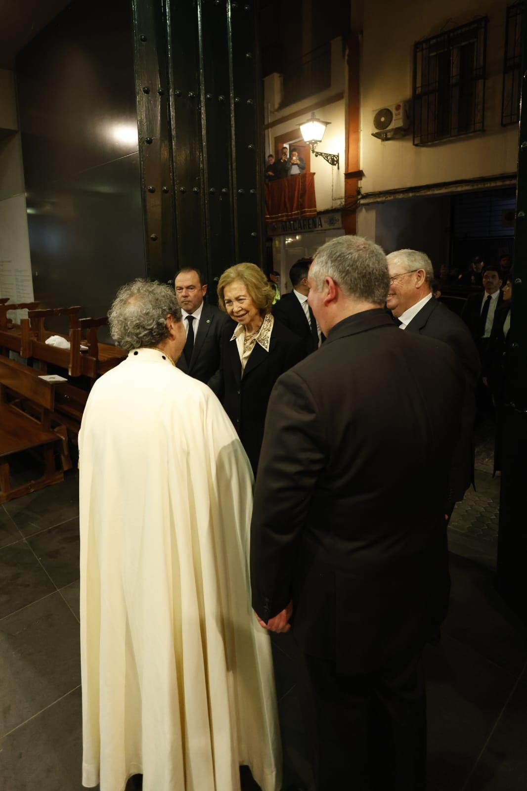 La reina emérita ha visitado la Basílica de la Macarena, previo a la solemne Madrugada hispalense, cénit de las celebraciones de la capital andaluza.