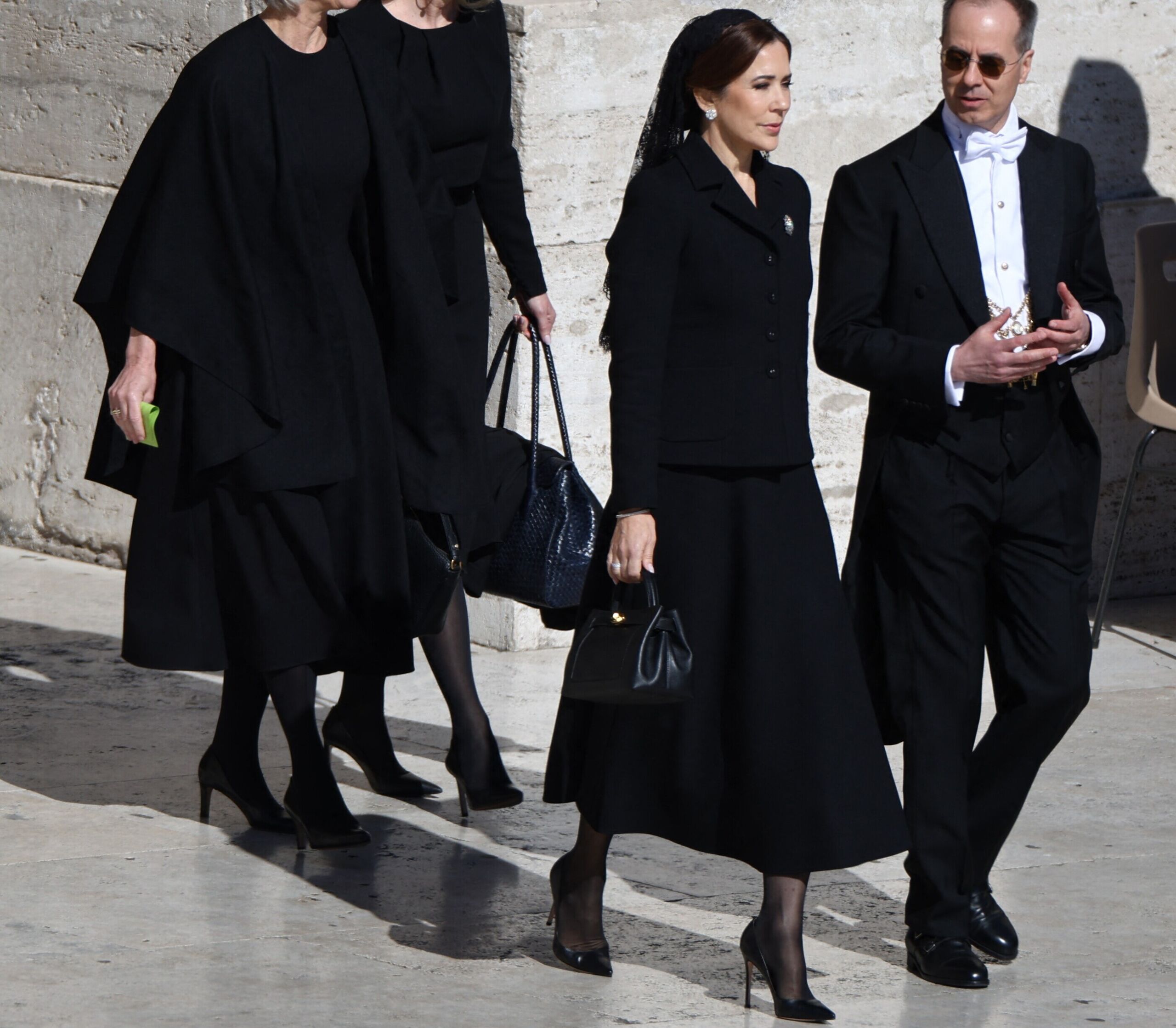 Encargada de representar a la Casa Real danesa en el funeral de Estado, ha llevado un elegante look compuesto de abrigo de solapa a modo de vestido, mantilla, broche y zapatos de tacón negro con medias a tono. La más elegante junto con la reina Letizia.