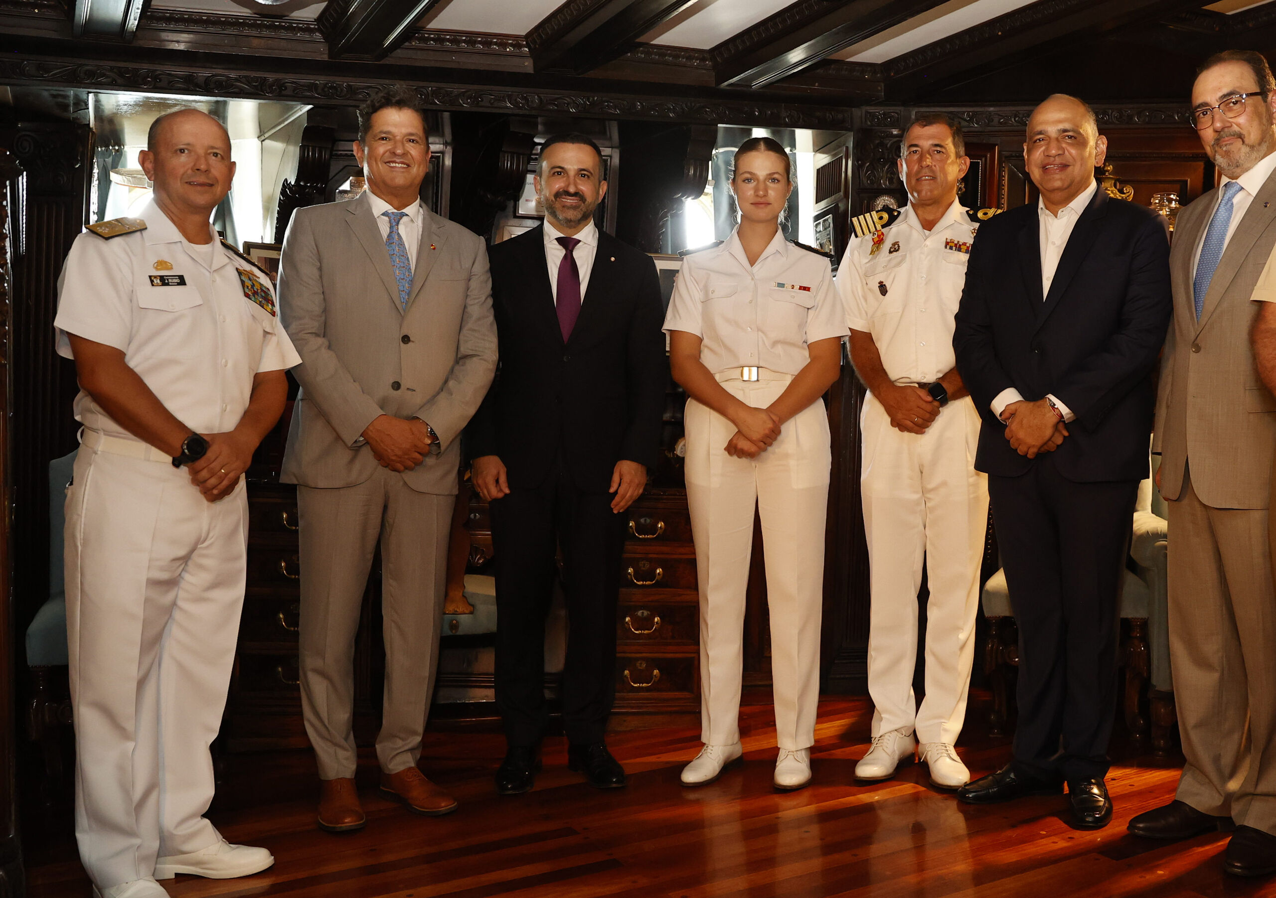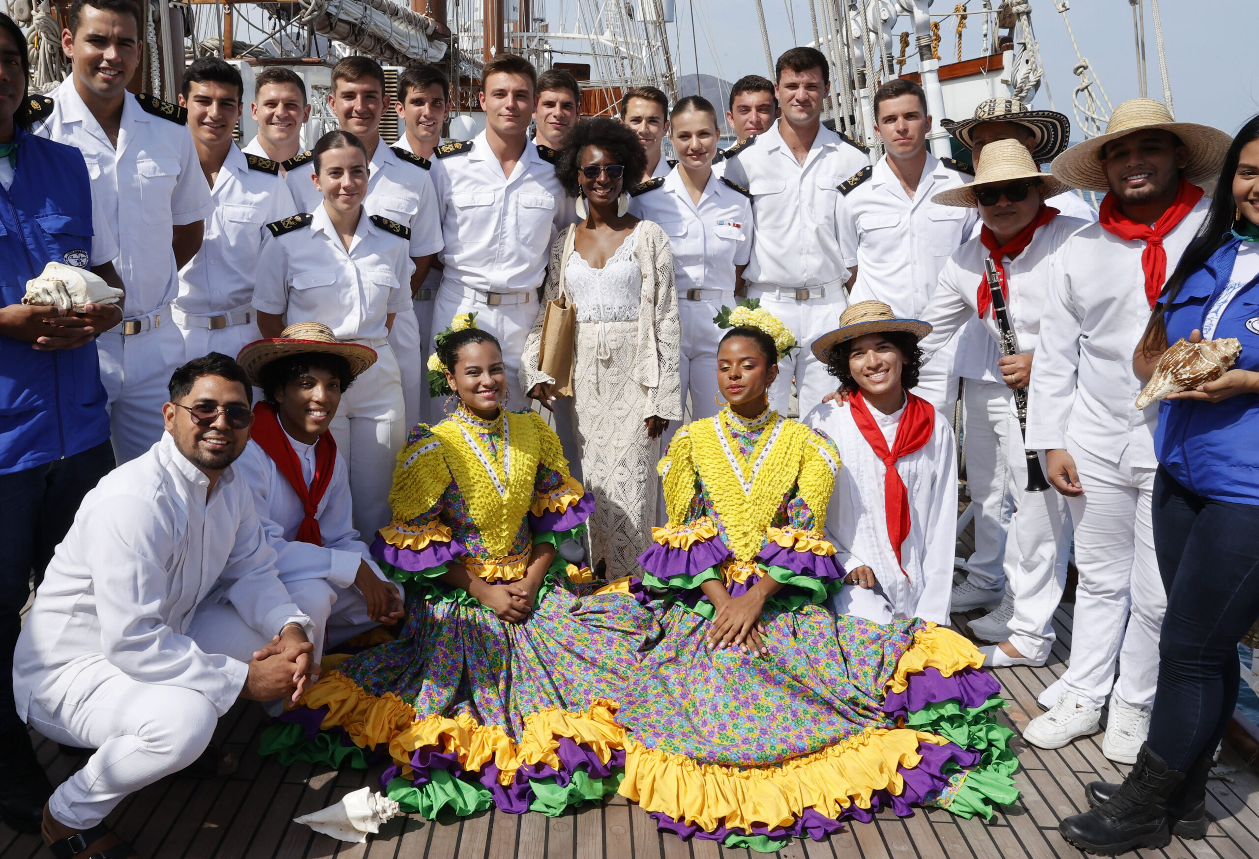 Durante la histórica escala que ha realizado el Juan Sebastián de Elcano en la ciudad colombiana de Santa Marta, que este año celebra el quinto centenario de su fundación, se ha celebrado una recepción presidida por la princesa Leonor donde han estado autoridades locales como el alcalde de Santa Marta, Carlos Pinedo, el embajador de España en Colombia, Santiago Jiménez y el cantautor colombiano Carlos Vives, oriundo de la ciudad y figura clave en la fusión del estilo tradicional del vallenato colombiano con el pop y el rock.
