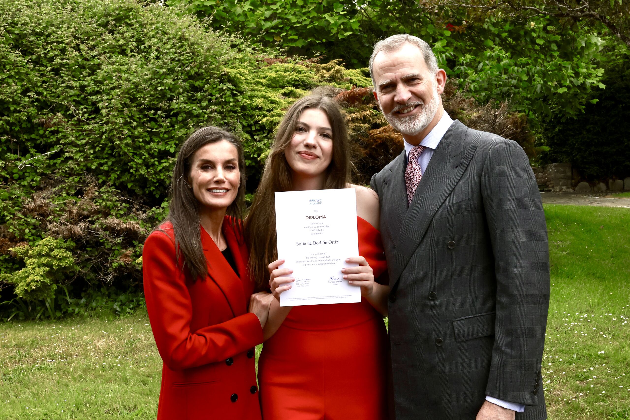 La infanta Sofía posa con el diploma obtenido en el UWC Atlantic College de Gales, en compañía de Don Felipe y Doña Letizia.