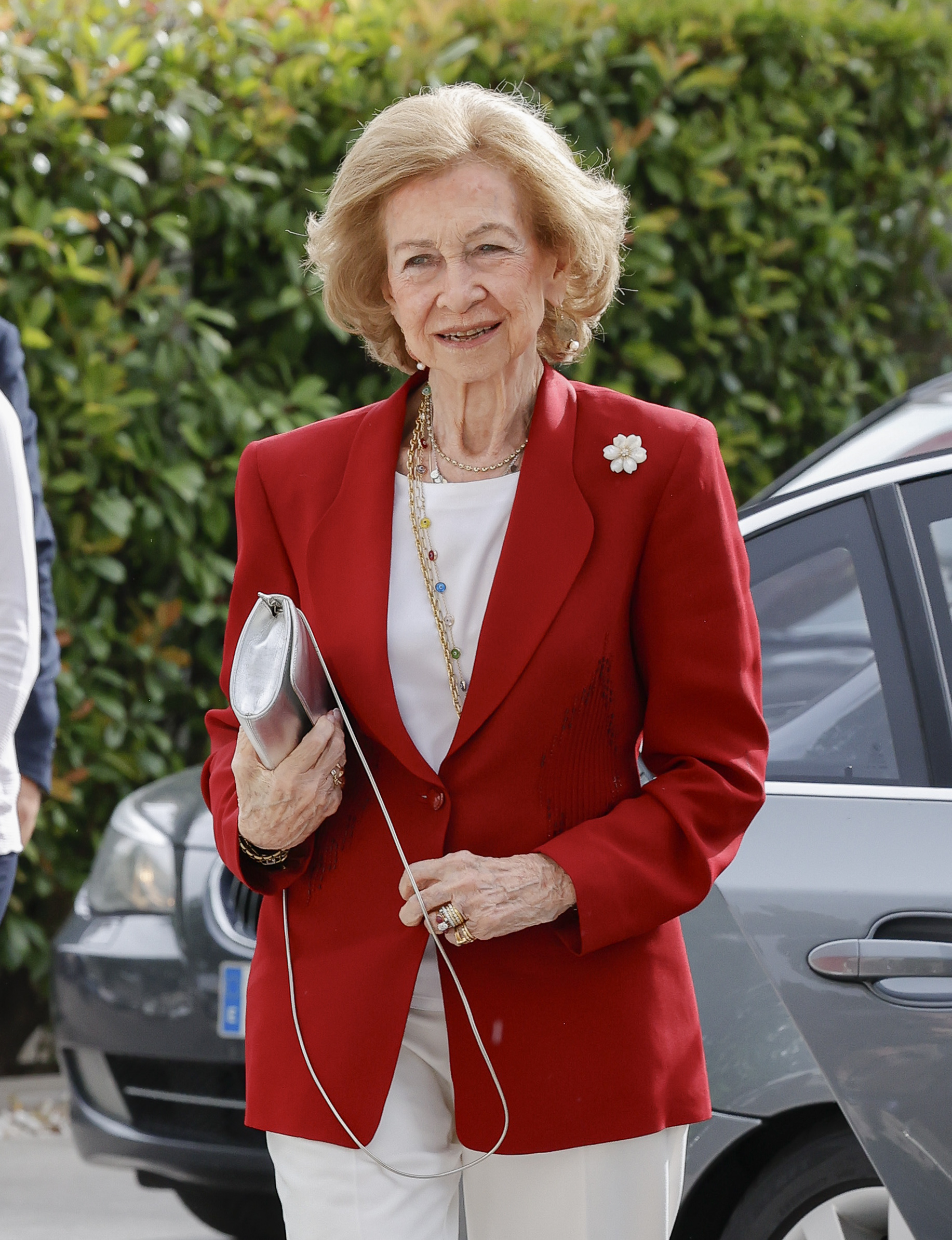 Para un día especial la reina emérita ha elegido un look impecable compuesto por pantalón de traje y top en color, ambos en color blanco, blazer de corte clásica en un rojo vibrante, y zapatos y cartera de mano en gris metalizado.