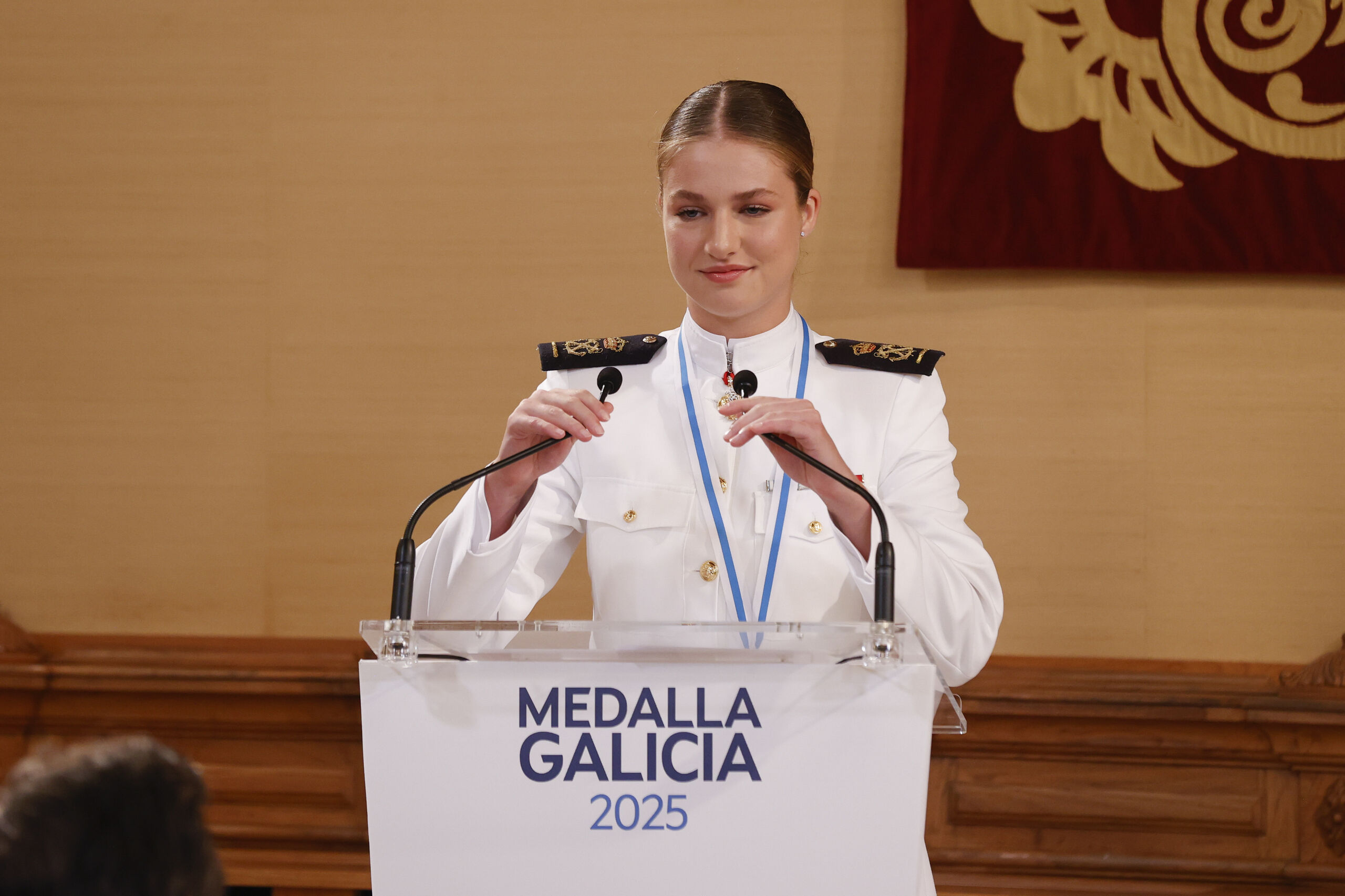 La princesa Leonor recibió este lunes la Medalla de Oro de Galicia, la máxima distinción de esta comunidad autónoma, una "tierra de acogida" y que "fue de emigrantes", ha dicho, en la que durante los meses que ha pasado como parte de su formación se ha sentido "una gallega más".