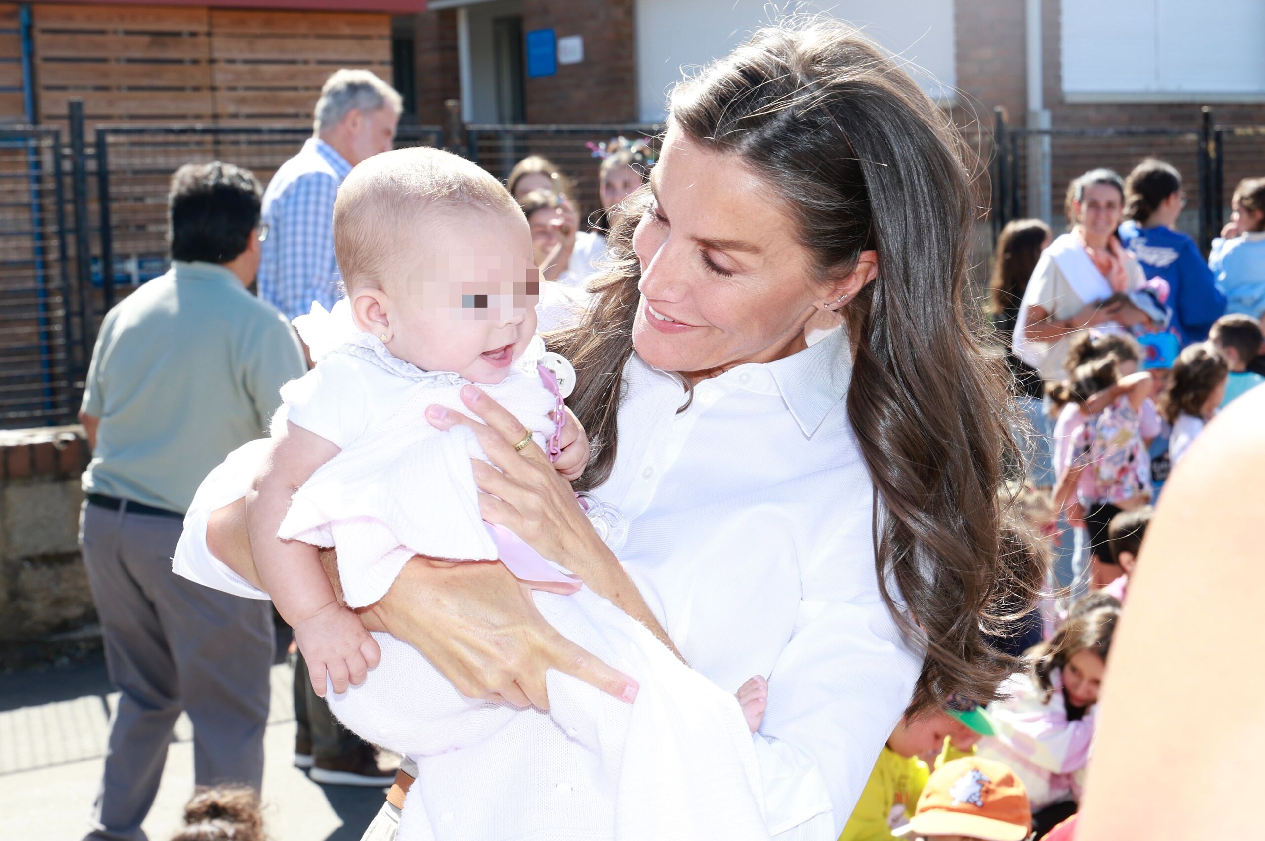 Doña Letizia no ha dudado en fotografiarse con una bebé, con la que se ha mostrado muy cariñosa