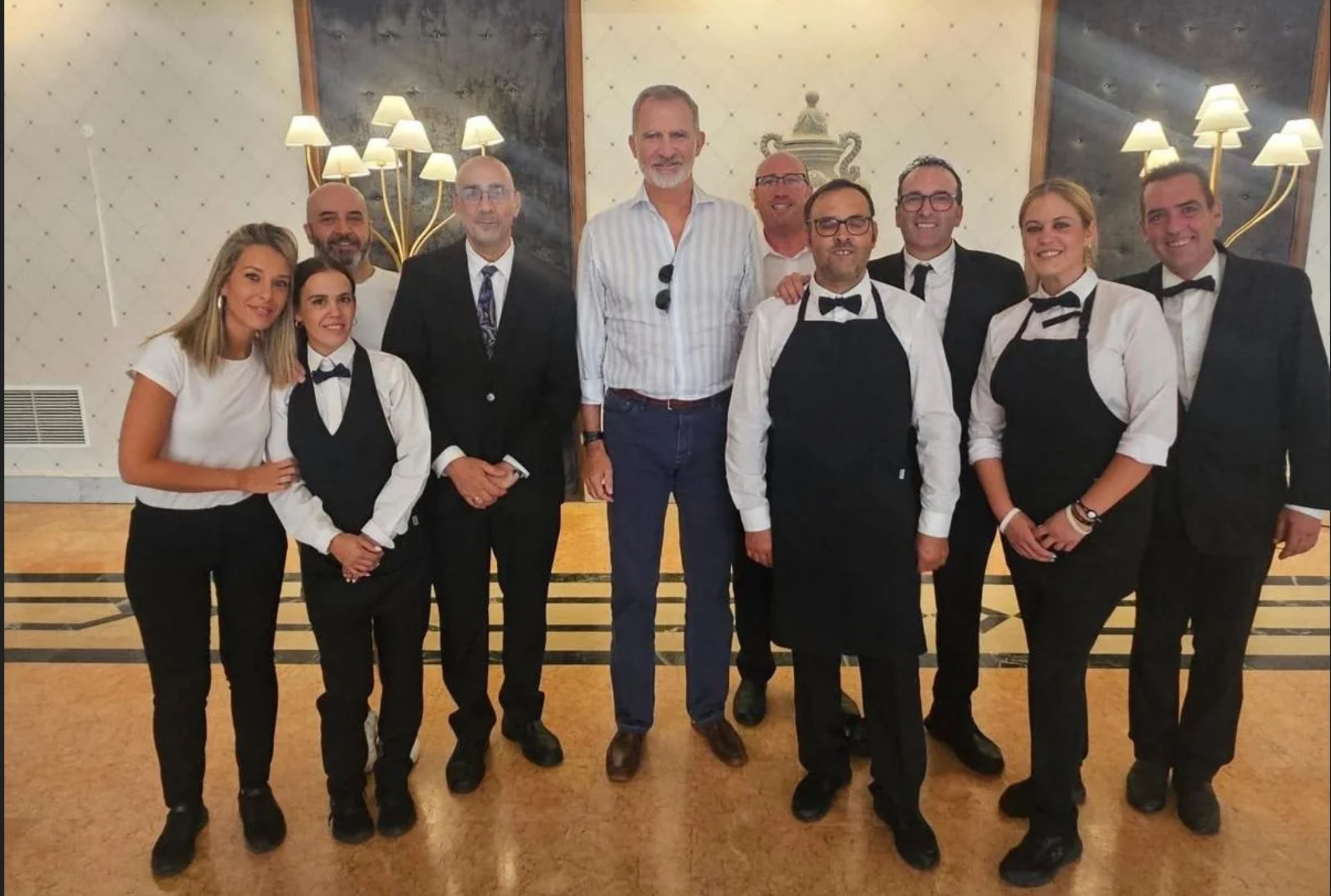 Muy cercano y cordial, Felipe VI no dudó en fotografiarse con el personal del hotel e incluso no dudo en posar junto a algunos de los invitados del enlace que se acercaron a él y le pidieron una foto. Para esta ocasión, Don Felipe vistió un atuendo muy relajado con una camisa blanca de rayas azules, pantalón vaquero y zapatos marrones.