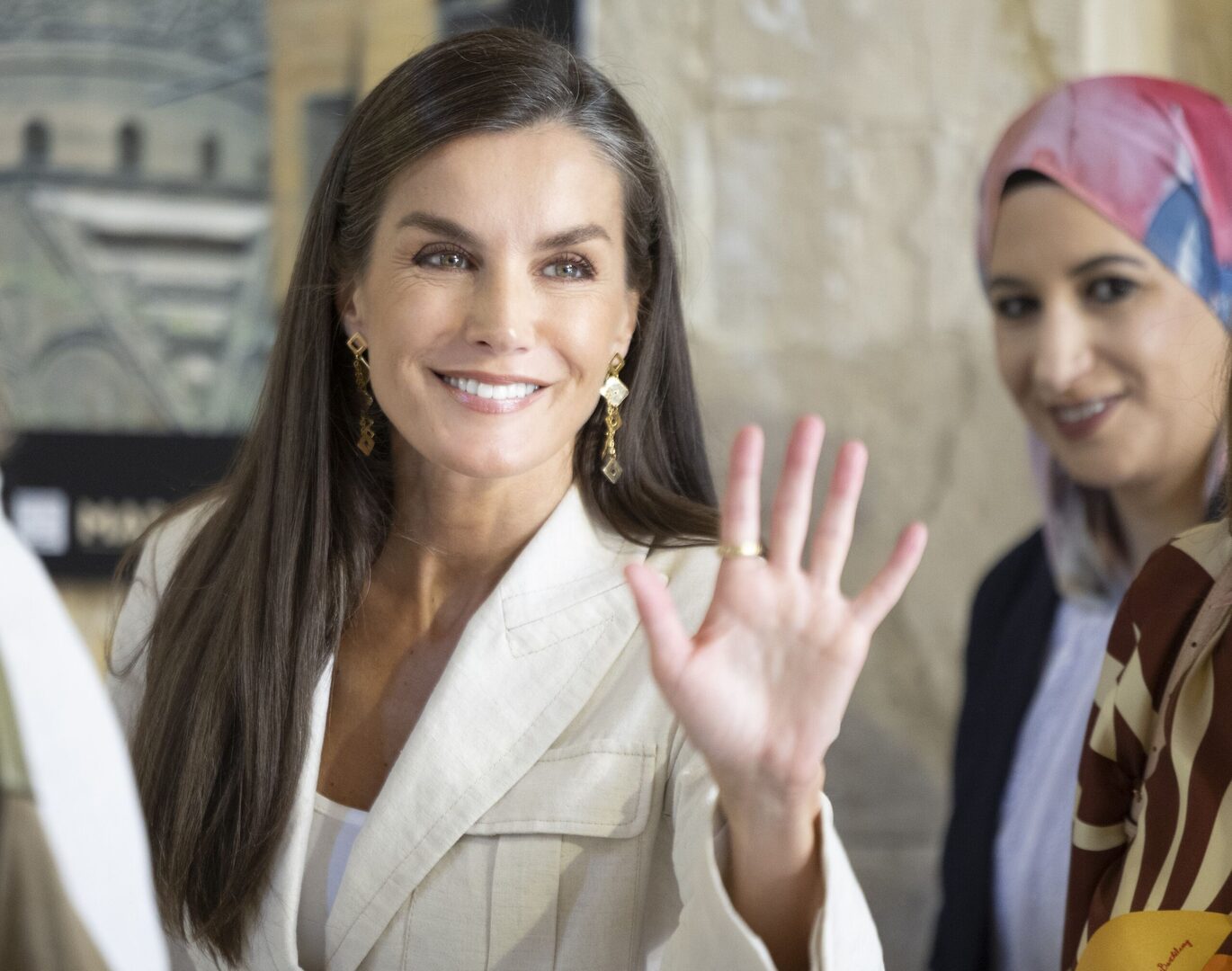 Para la ocasión, Doña Letizia ha lucido una chaqueta de lino de inspiración sahariana de la diseñadora egipcia Dina Shaker, con sede El Cairo. Lo ha combinado con unos pantalones blancos y zapatos tipo de Sézane. Otro de los guiños han sido los pendientes, un modelo dorado con varios rombos en cascada de Mishka, un taller que se dedica a las joyas y al cuero, donde trabajan 60 mujeres, y que cuenta con el apoyo de la Cooperación Española.