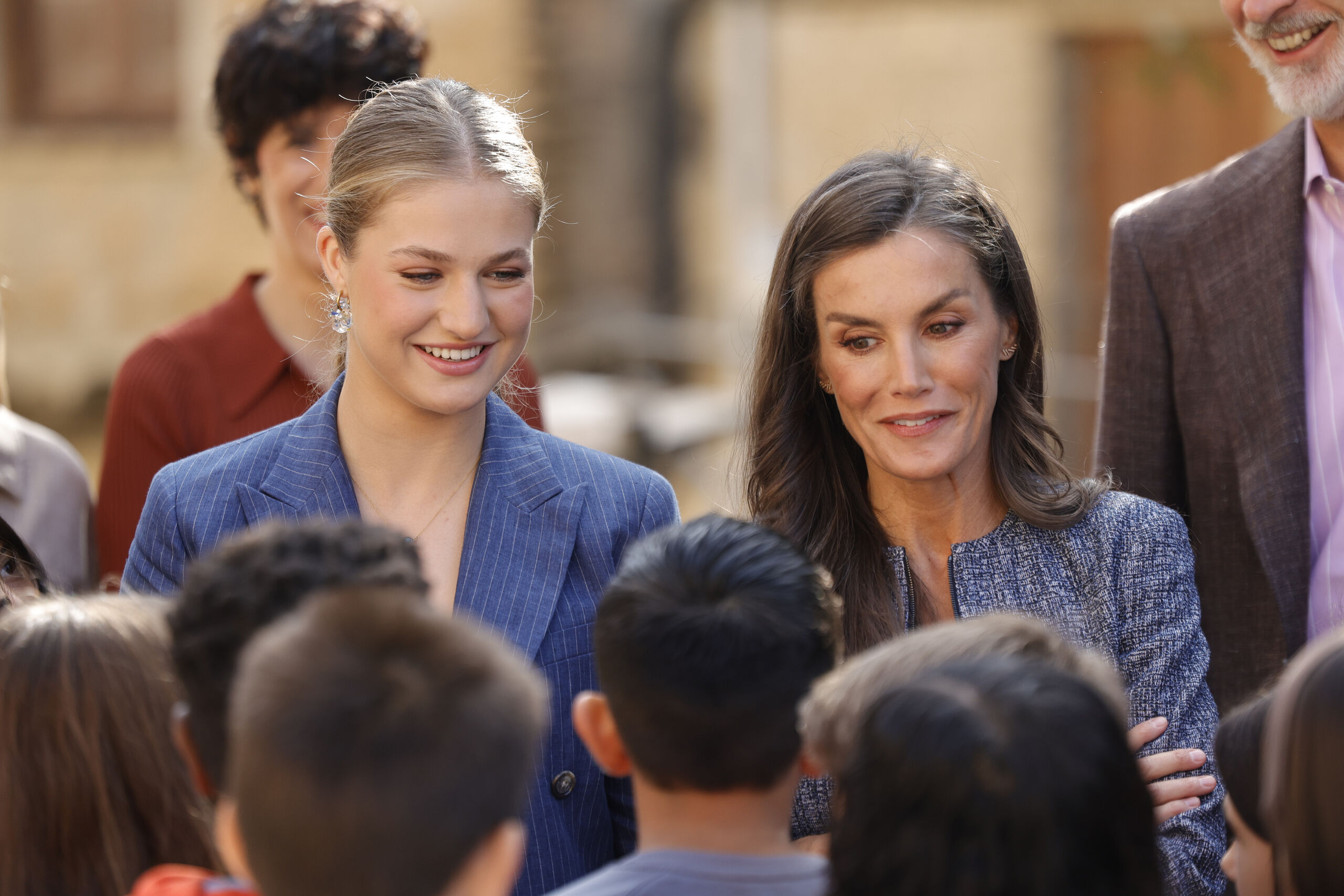 Para su primer día de visita a Navarra, la princesa Leonor optó por la fórmula de chaqueta en color azul oscuro, con una sutil raya diplomática de Hugo Boss.