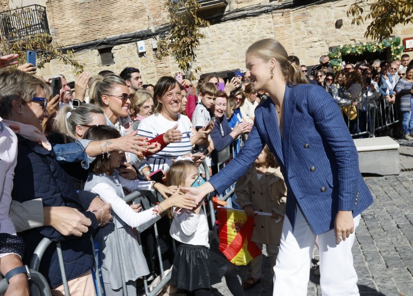 Los Reyes y la Princesa Leonor a su llegada a Olite, donde se han detenido a saludar a las numerosas personas que les esperaban. Una vecina regaló una pulsera de la Virgen de Ujué a la Princesa Leonor “para que la proteja siempre".