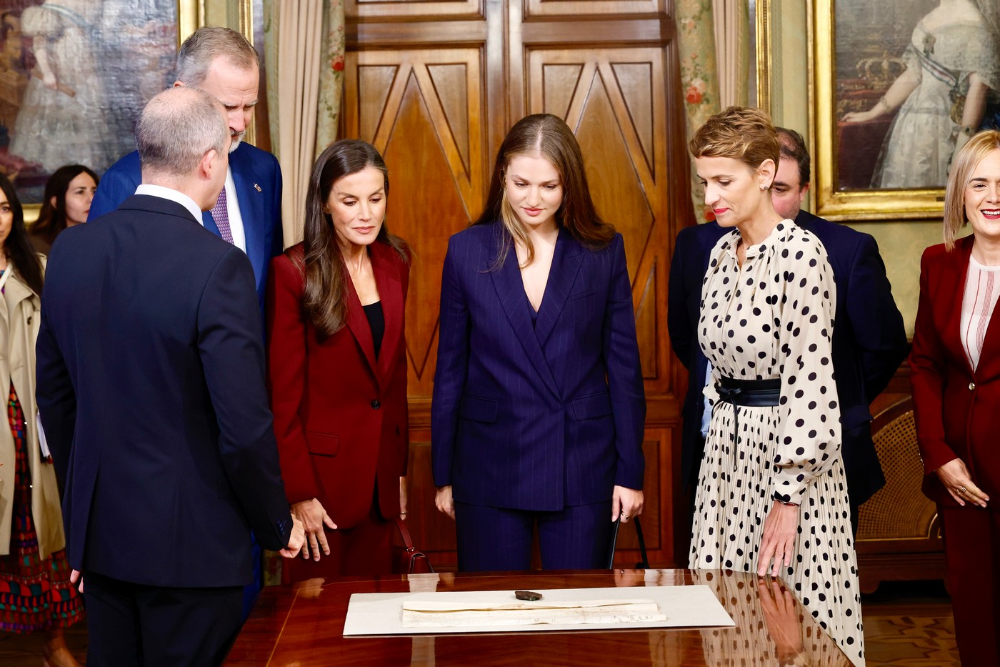 La Princesa Leonor ha visitado por primera vez la Comunidad Foral de Navarra y ha protagonizado su primer acto oficial como Princesa de Viana, título creado por el rey Carlos III el Noble en 1423 para su nieto, Carlos. Ha estado acompañada de Don Felipe y Doña Letizia. Fueron recibidos por la presidenta María Chivite y la ministra Elma Saiz. No asistieron ni las dos vicepresidentas ni los dos consejeros de Geroa Bai, socios de gobierno de Chivite.