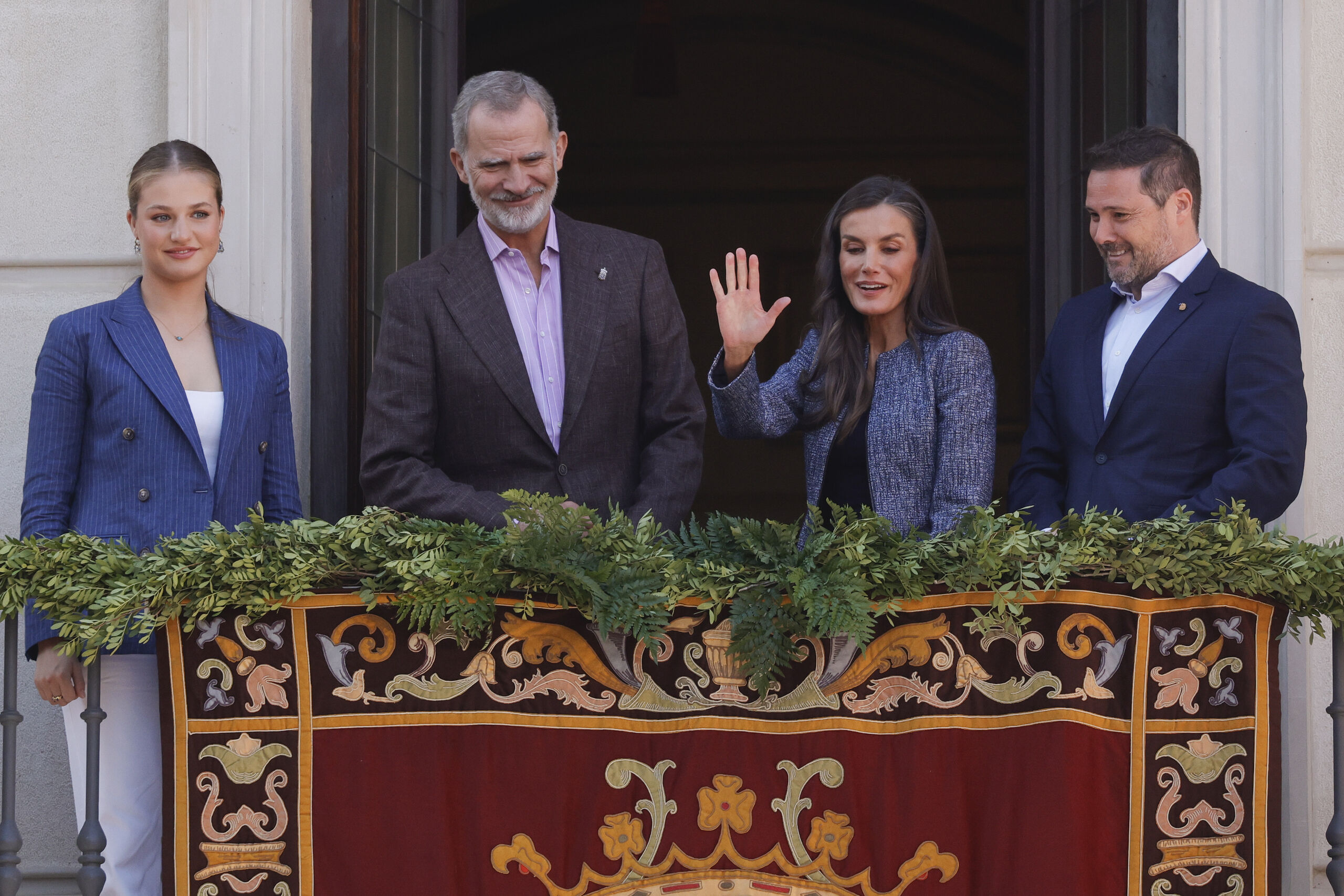 Los Reyes y la Princesa Leonor, acompañadas de Alejandro Toquero, alcalde de Tudela. Posteriormente, cuando se han retirado los reyes, han salido al balcón la presidenta María Chivite y la ministra Elma Saiz, que han sido abucheadas con gritos de "¡fuera, Chivite!»"