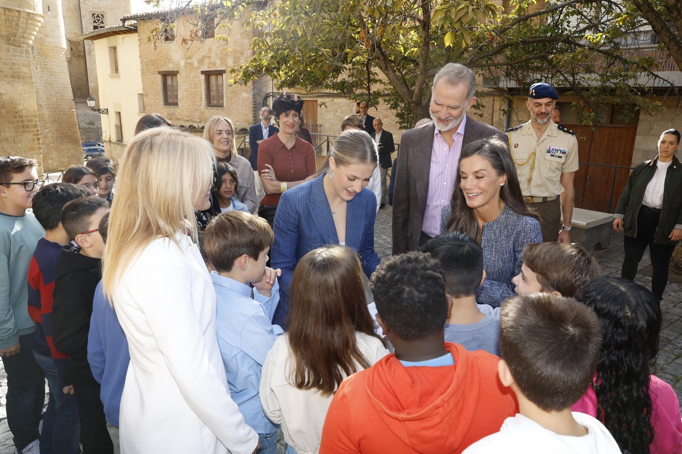 Los Reyes y la Princesa Leonor han compartido unas palabras con los jóvenes estudiantes del Colegio Príncipe de Viana, a algunos de los cuales la princesa de Viana ha dado su autógrafo con una dedicatoria. Un alumno, Lucas, ha regalado una pulsera a la Princesa confesando “Es el día más nervioso de mi vida".