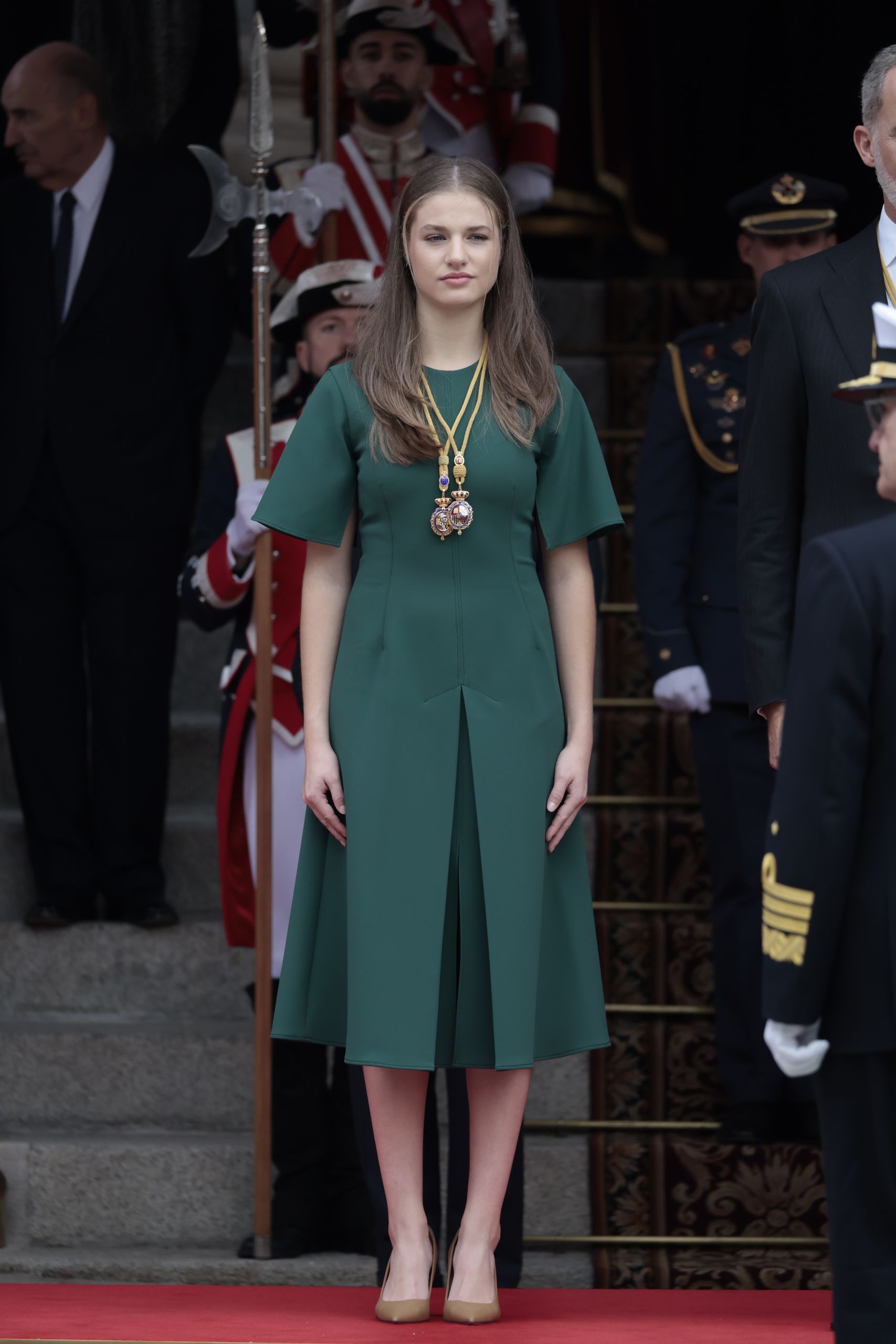 Se trata de un vestido midi, cuello redondo a la caja, con manga francesa de tipo capa fluida, minimalista y de líneas puras y silueta evasé con falda con ligero vuelo y abertura frontal dejando entrever sus piernas de Adolfo Domínguez. Se trata del mismo diseño que llevó la Princesa Leonor en color verde durante la apertura de la XV Legislatura en el Congreso de los Diputados.
