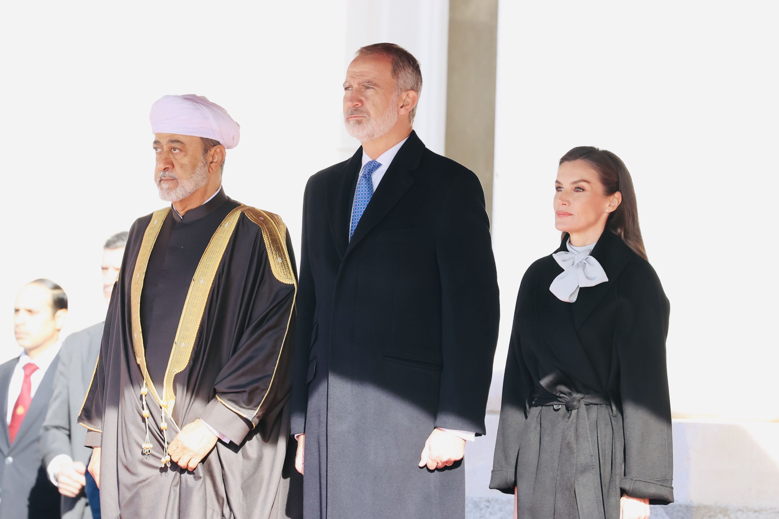 En una fría mañana, los reyes han recibido al sultán a pie de coche. El sultán, que llegó ayer por la tarde a nuestro país y se ha instalado en el Palacio de El Pardo, ha acudido a España sin la compañía de su mujer la reina Sayyida Ahad bint Abdullah bin Hamad Al Busaidiyah, ya que no suele acompañar a su marido en viajes oficiales, a pesar de tener un rol muy activo en su país.