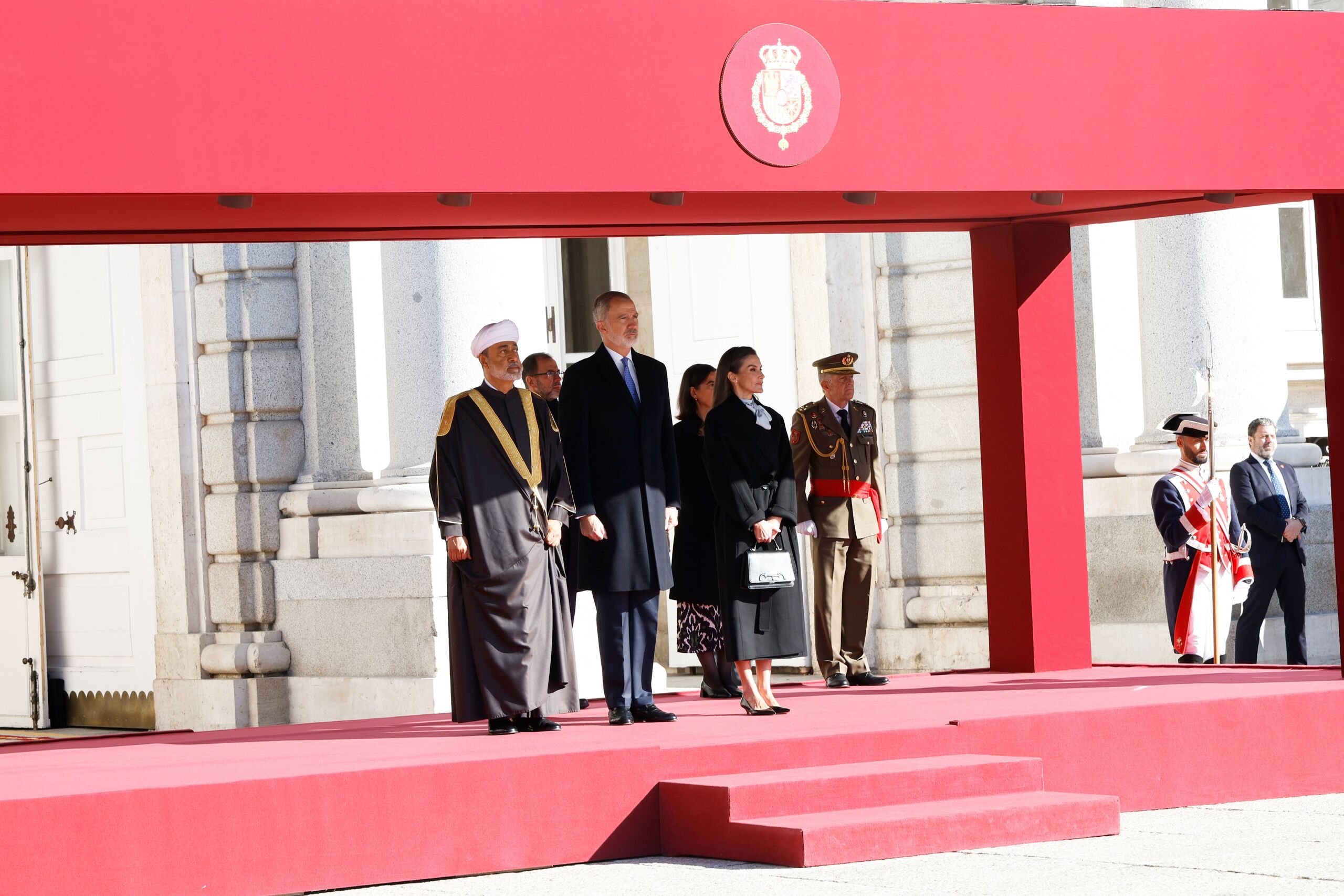 Don Felipe y Doña Letizia han recibido este martes en el Patio de la Armería del Palacio Real de Madrid al sultán de Omán, Haitham Bin Tarik, en la ceremonia de bienvenida con la que inicia su visita de estado a España.