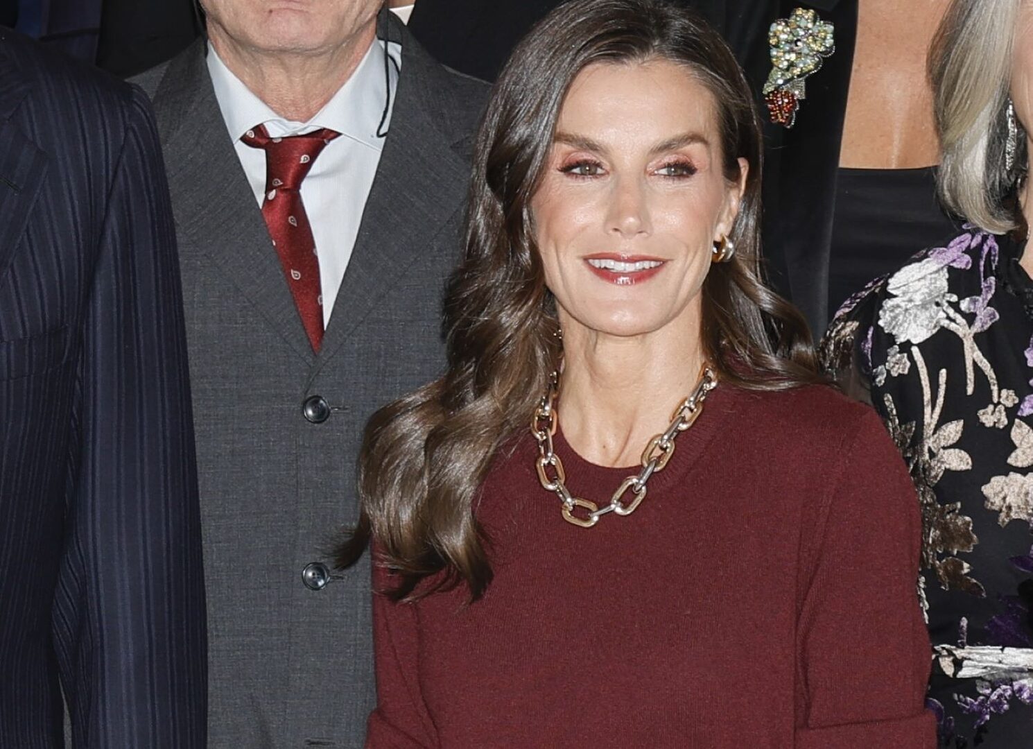 En esta ocasión ha apostado por un total look color burdeos/vino, con un jersey de cashmere de Falconeri, que ya estrenó en la Pascua Militar de 2025 y ha estrenado una falda midi recta, cubierta de lentejuelas y bajo con una banda opaca del mismo color de la lentejuela de Massimo Dutti. Lo ha combinado con unos zapatos destalonados de tacón sensato del mismo color y cartera de mano rígida en la misma tonalidad, ambos de Magrit. Para romper la monotonía del mismo color, ha estrenado un collar dorado de eslabones y pendientes de aros.