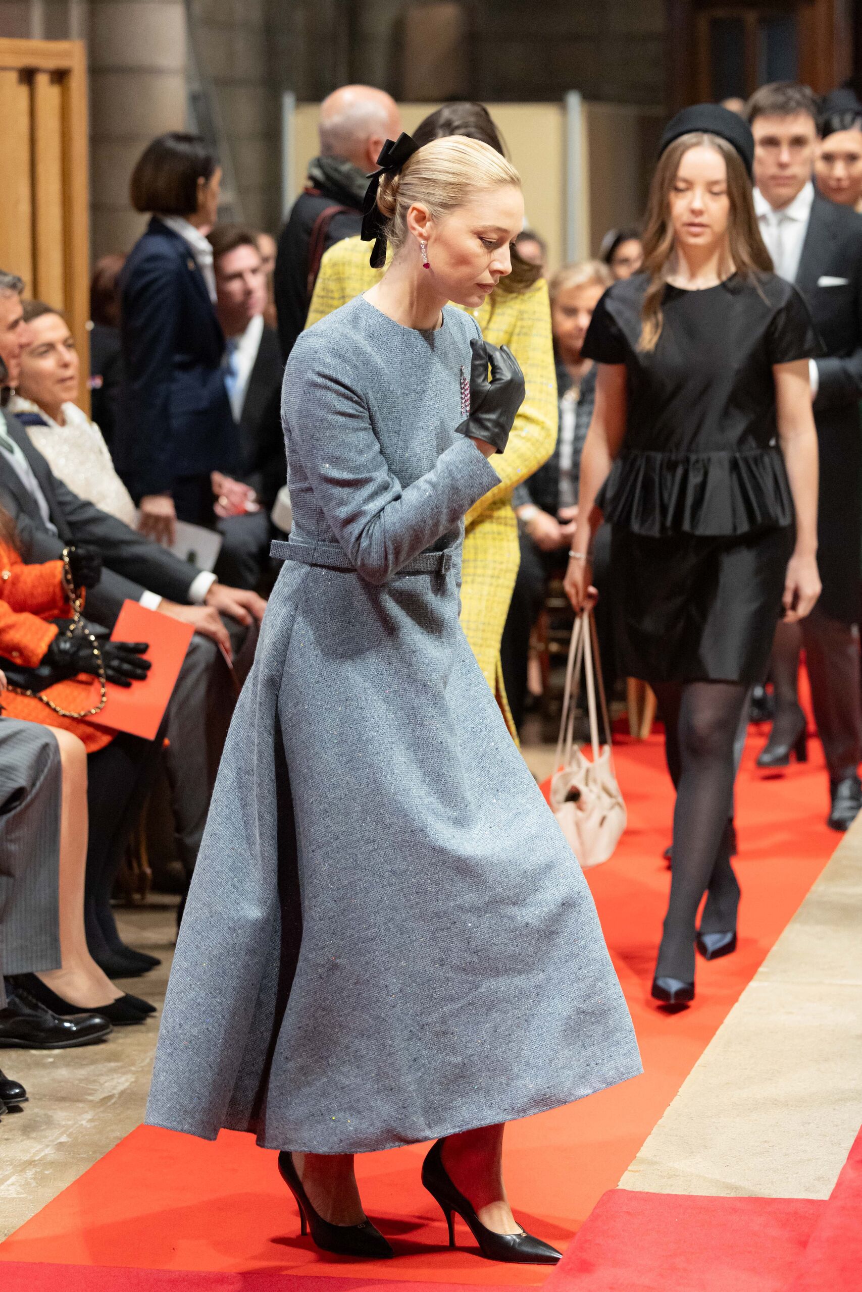 Beatrice Borromeo, impecable con un total look de Dior en gris, santiguándose a su llegada a la catedral de Mónaco.