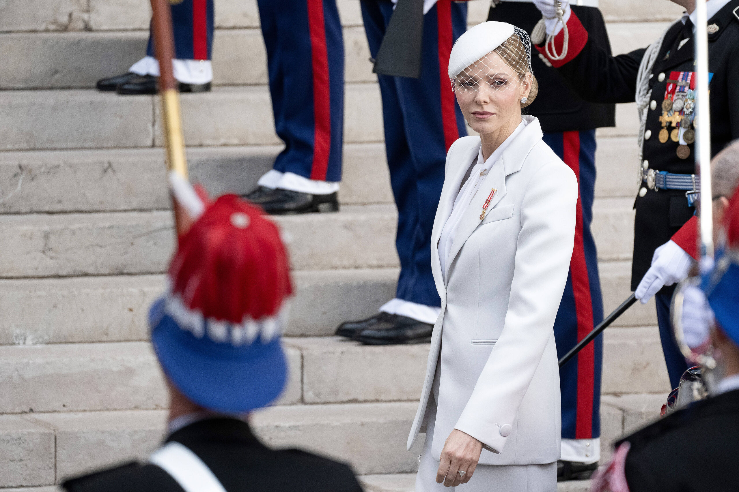 La princesa Charlène, que en los últimos tiempos siempre acude vestida con los colores de la bandera nacional de Mónaco, ha lucido un traje blanco de pantalón y chaqueta con tocado con redecilla.