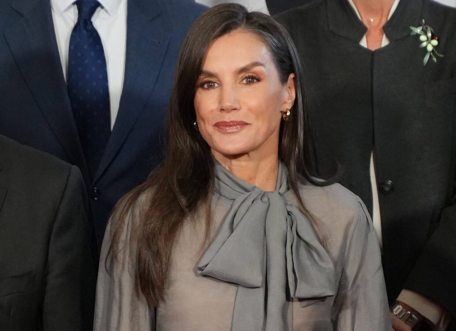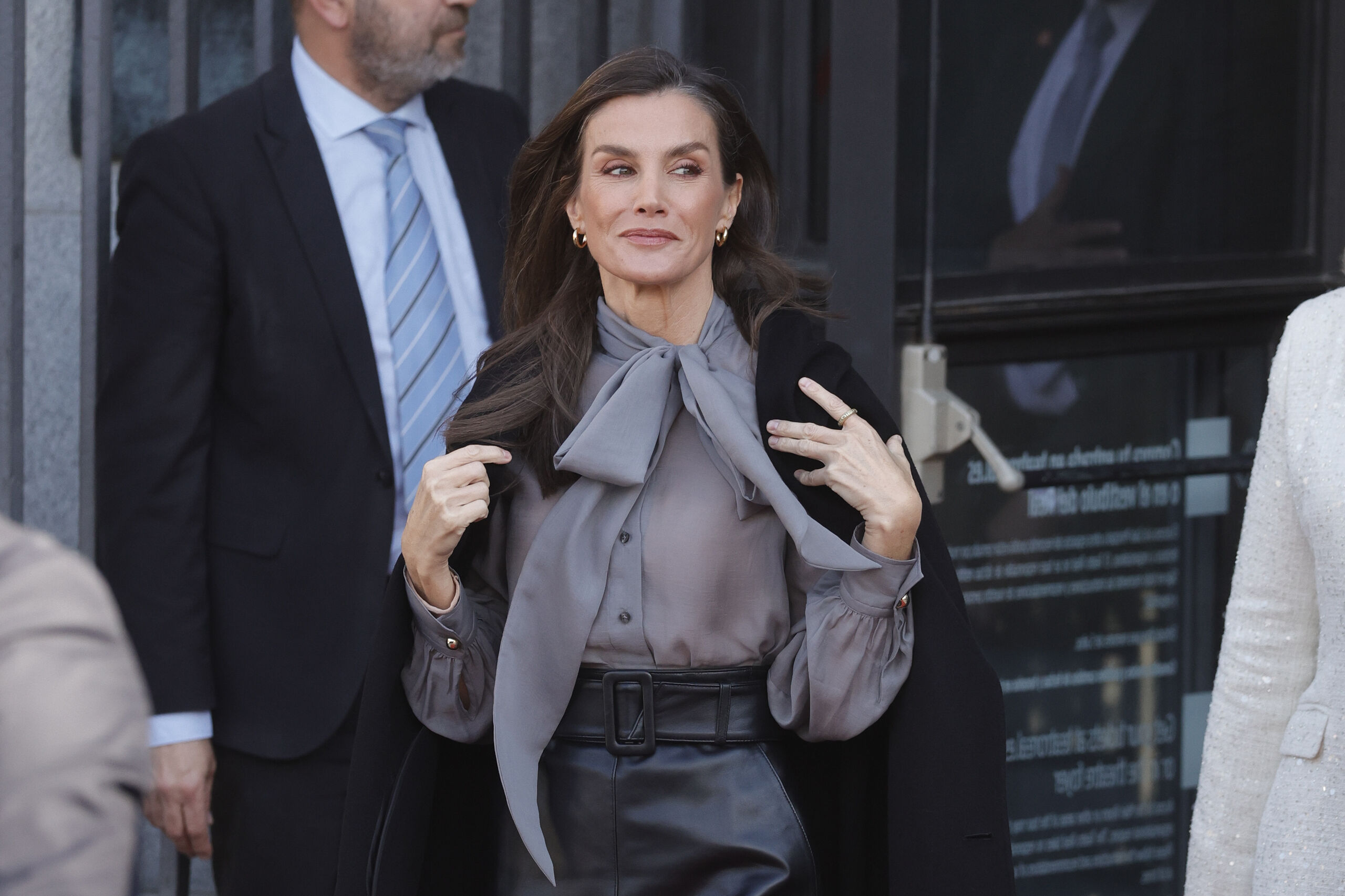 Para esta ocasión, la Reina ha impactado con un "mix&match" protagonizado por un nuevo estreno, una blusa en color gris perla ligeramente transparente, de tejido fluido, mangas abullonadas, maxi lazada al cuello y puños marcados con cierre de un solo botón, de la temporada pasada de Hugo Boss. Lo ha combinado con una falda de cuero negra, de largo midi, bolsillos laterales y cinturón ancho a juego de Hugo Boss, que estrenó en 2022, en una reunión de trabajo con miembros del Consejo Nacional de la Asociación Española Contra el Cáncer en Madrid. Para combatir la fría mañana en Madrid, ha elegido un abrigo negro de paño de Carolina Herrera, que ha lucido sobre los hombros.