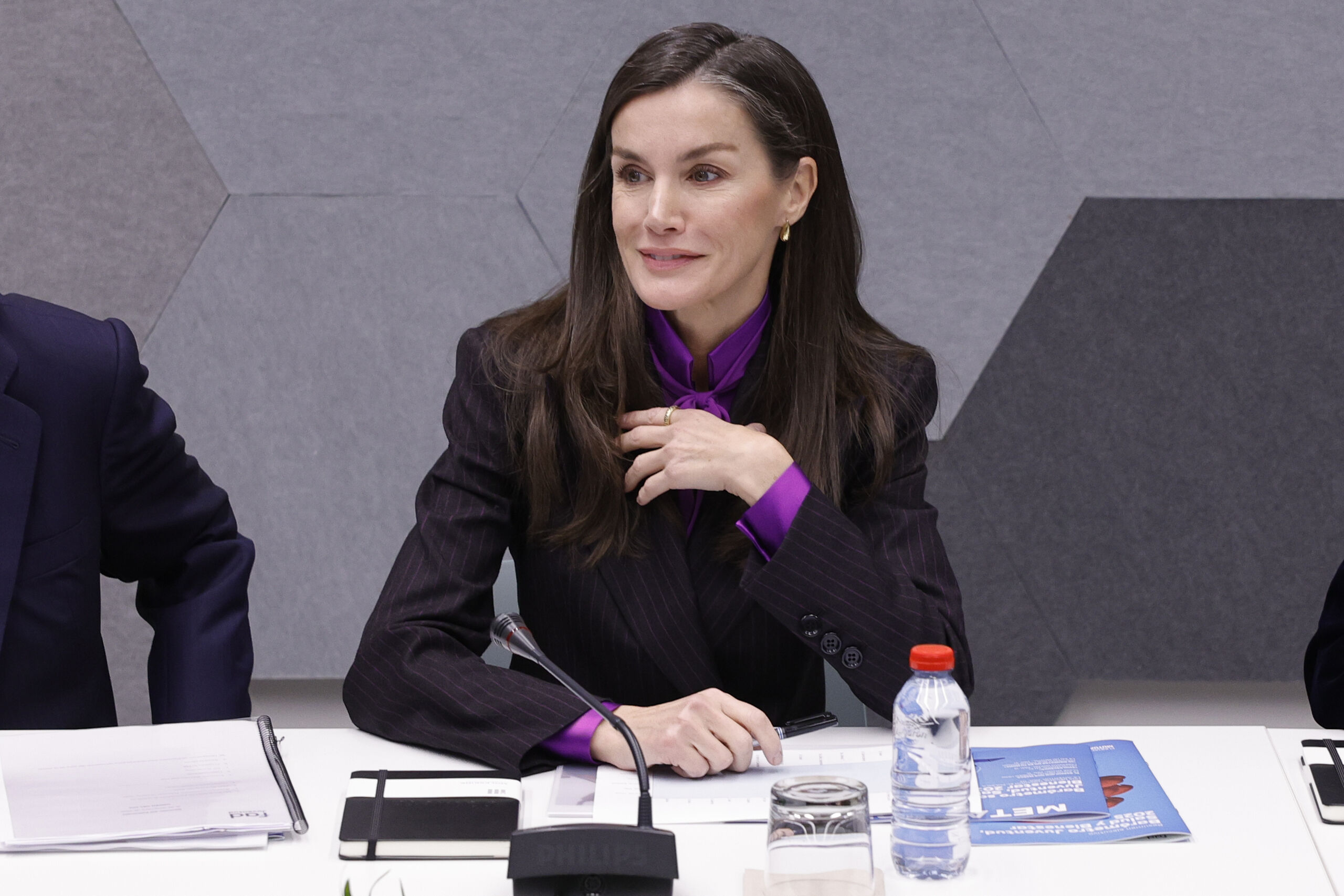 Para esta reunión, ha vuelto a optar por uno de sus looks de trabajo preferidos: traje pantalón con blazer a juego y camisa con maxi lazada en el cuello con la que rompe la sobriedad del traje. En esta ocasión, ha estrenado un nuevo traje sastre de color gris y raya diplomática de Hugo Boss, con americana cruzada y pantalón de talle alto, con camisa en color morado que estrenó en 2009 con lazo, cuello elevado, detalle de raso en el cuello y mangas semitransparentes, y que volvió a lucir ese mismo año en una audiencia con la Diputación Permanente y Consejo de la Grandeza de España en Madrid. Una camisa firmada por quién fuera su modisto de cabecera durante muchos años, Felipe Varela, y del que ya no utiliza prendas desde 2019 ni tiene tampoco el "monopolio" de su vestidor.