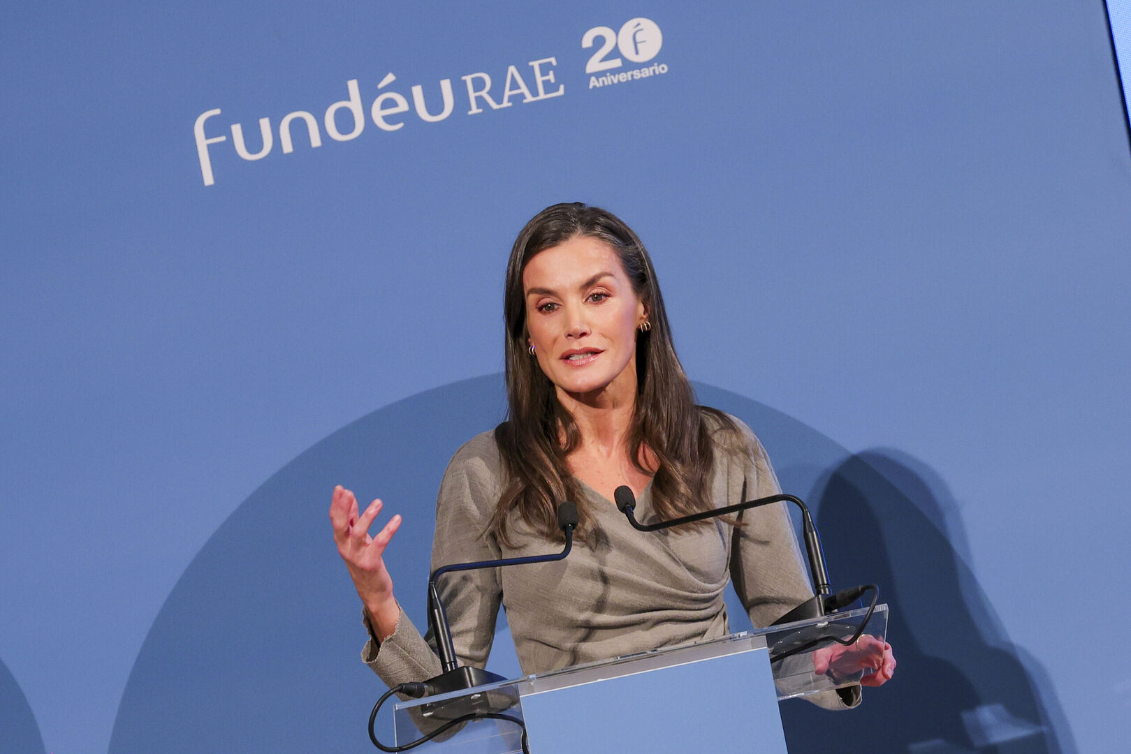 Segundo acto de la semana para Doña Letizia, que ha acudido a la Real Academia Española para participar en la conmemoración del 20º aniversario de la Fundación del Español Urgente 'FundéuRAE' que tiene como principal objetivo velar por el buen uso del español en los medios de comunicación, y del que es presidenta de Honor.