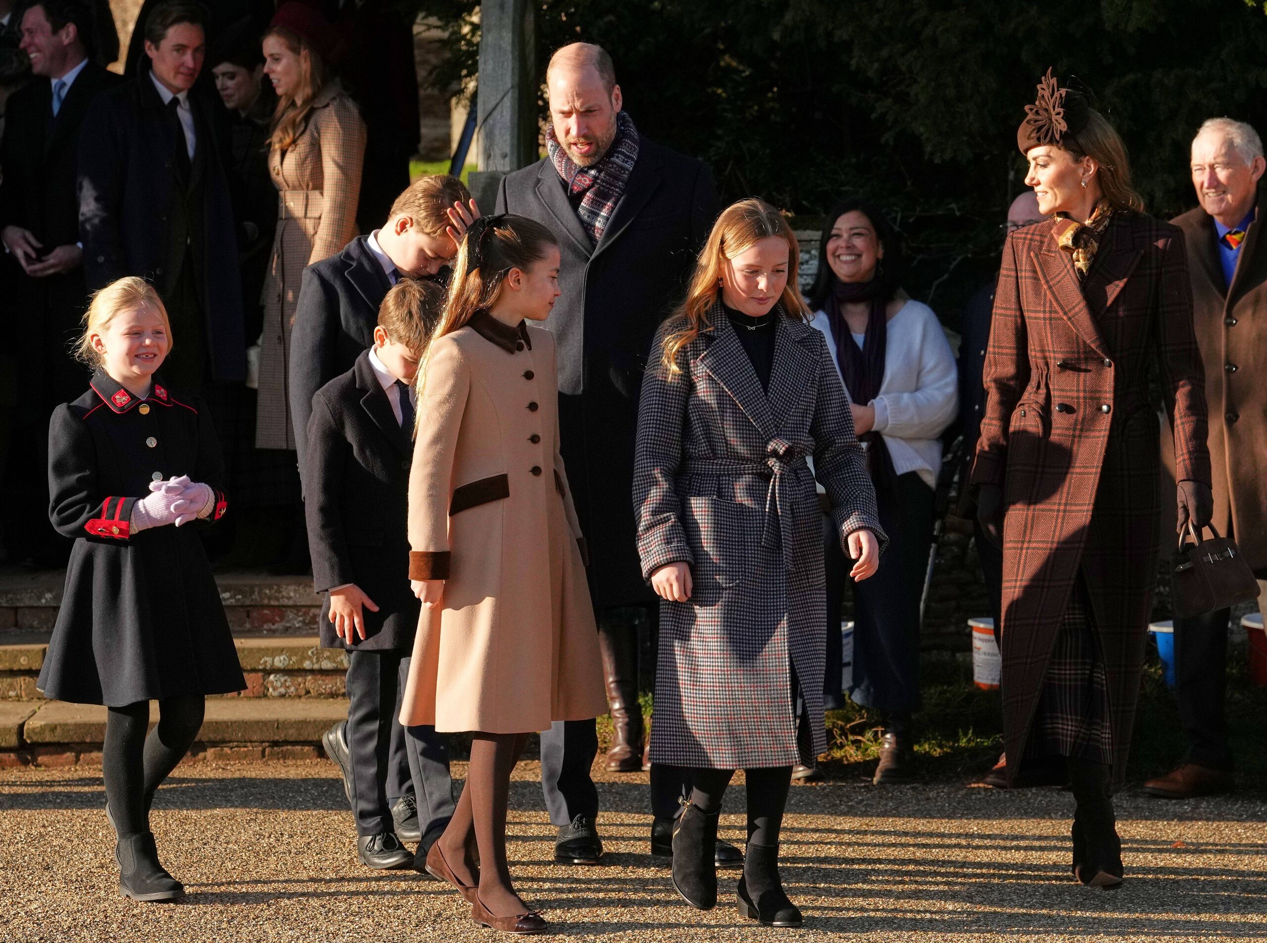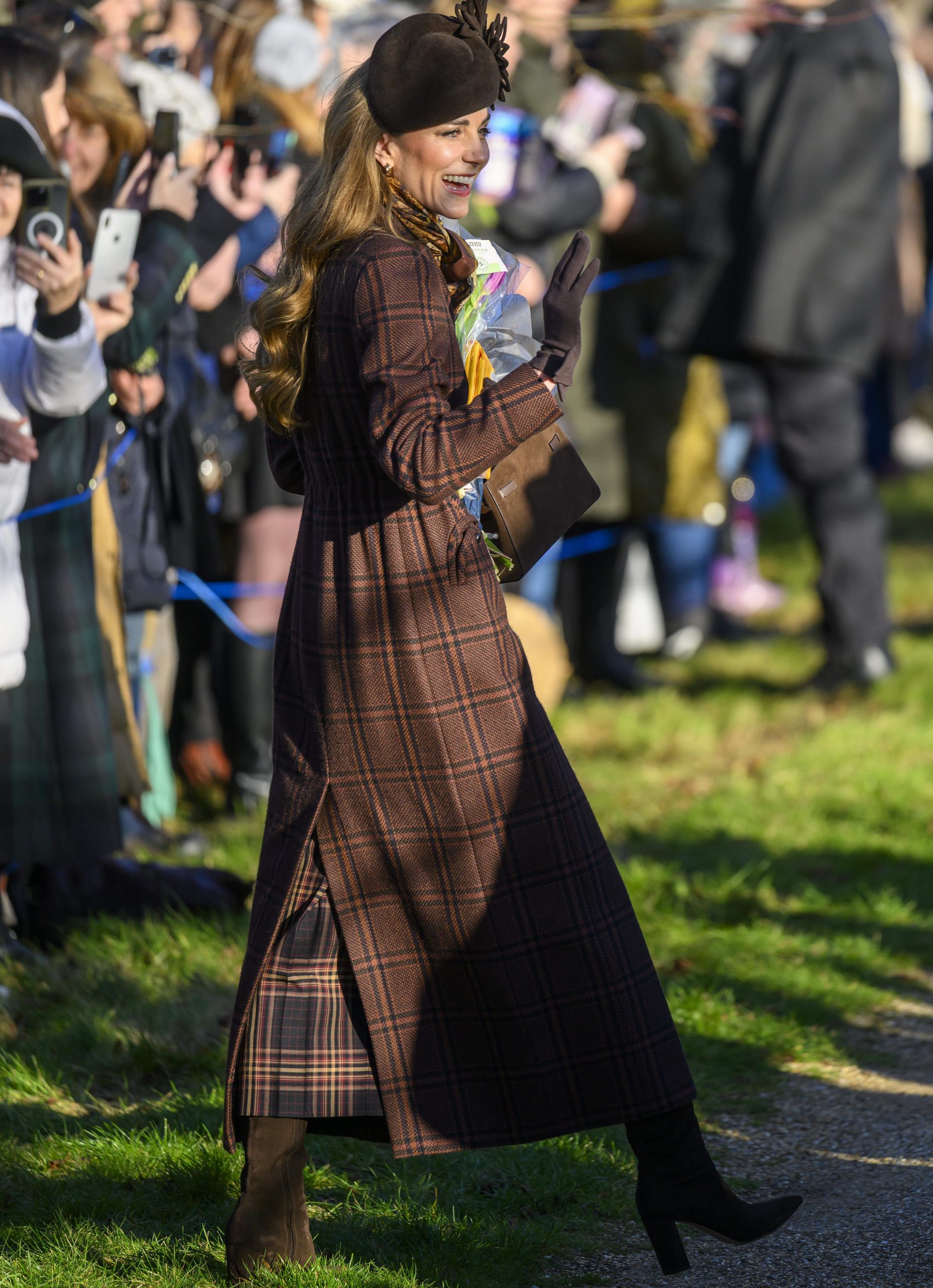 Una cita a la que no han faltado los príncipes de Gales acompañados de sus tres hijos, el príncipe George, la princesa Charlotte, y el príncipe Louis. Para esta ocasión, Kate Middleton ha apostado por un abrigo de lana con estampado de tartán en tonos marrones, ligeramente entallado y doble botonadura de la firma Blazé Milano. No podría faltar el tocado, también en color chocolate, de tipo percher, de una de sus sombrereras favoritas, Juliette Botterill Millinery. Como joyas, los pendientes Trinity de Cartier.