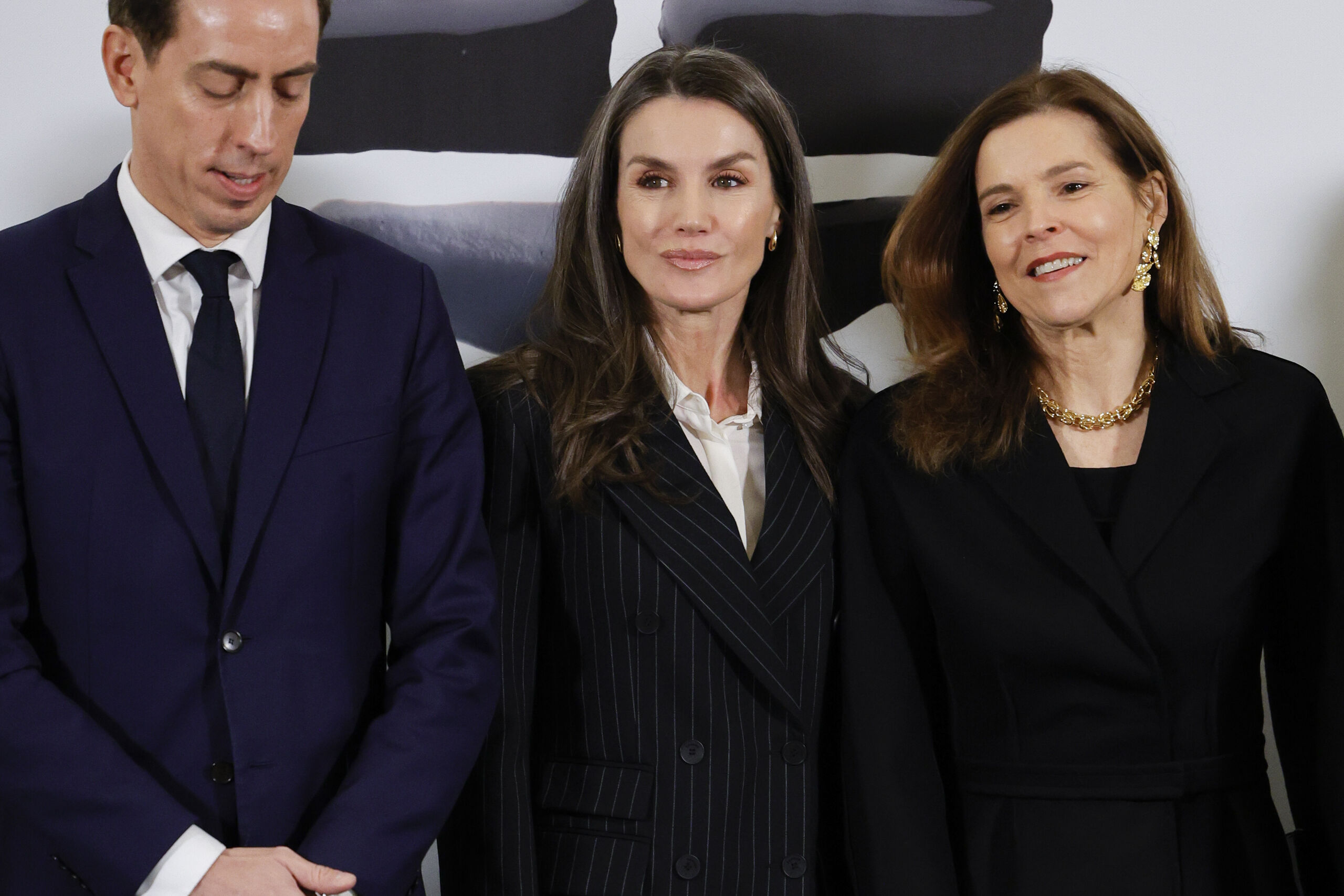 Para presidir estos premios periodísticos celebrados en la Real Academia de San Fernando, la Reina ha vuelto a recurrir a la sobriedad y ha optado por un traje pantalón, que en los últimos meses se ha convertido en su look de trabajo favorito. En esta ocasión se ha decantado por un dos piezas con pantalón amplio, en color negro y raya diplomática de la firma Sandro, que estrenó en un acto por el Día Mundial de las Enfermedades Raras en Oviedo, en marzo de 2025. A diferencia de aquella ocasión, no ha lucido el pañuelo anudado a modo de corbata, y ha elegido una camisa beige, con el cuello ligeramente abierto. Como complementos, unos pendientes dorados de PDPAOLA.