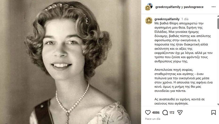 Pablo de Grecia, actual jefe de la casa real helena tras el fallecimiento de su padre el rey Constantino en 2023, se ha despedido de su tía, la princesa Irene con una emotiva carta a través de sus redes sociales.