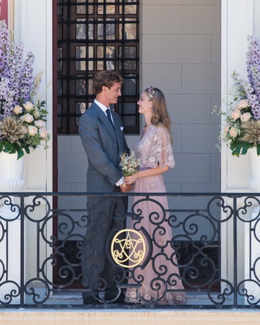 Beatrice Borromeo, para su boda civil con Pierre Casiraghi, eligió a la firma Valentino para gracias a la amistad con el diseñador. Un vestido rosa pálido con capa en chifón y bordados florales creado por Maria Grazia Chiuri y Pierpaolo Piccioli