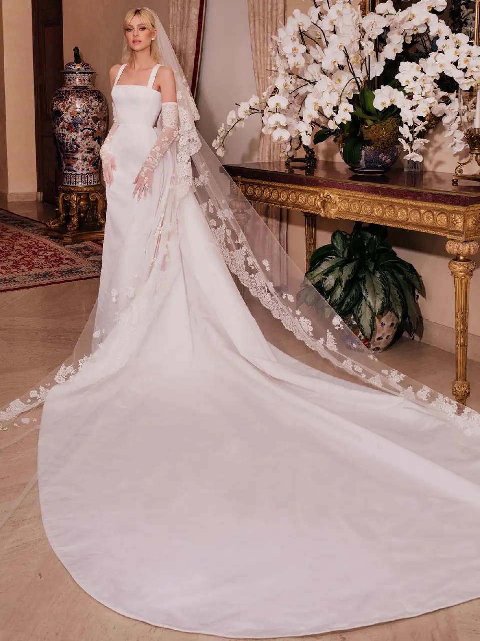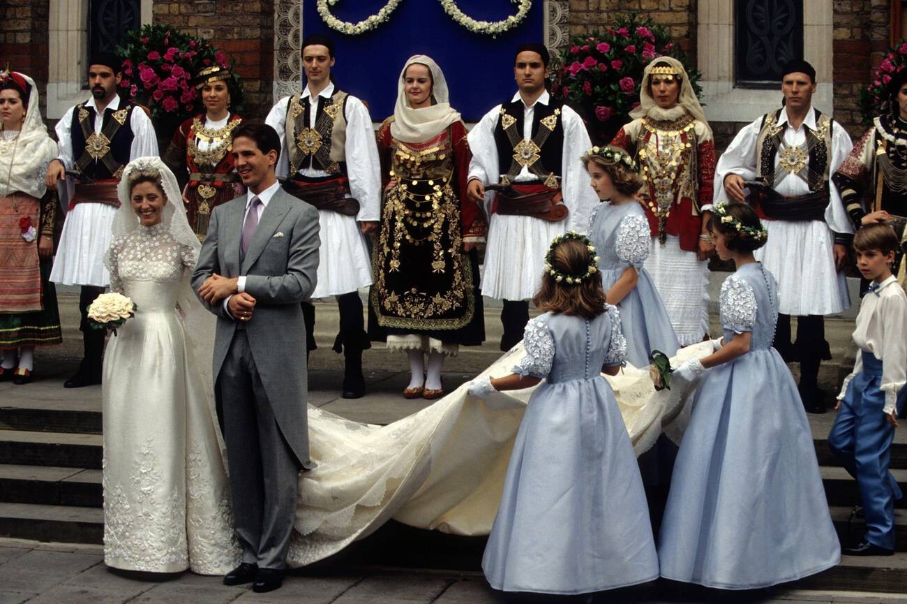 Marie-Chantal Miller estuvo espectacular en su boda con Pablo de Grecia gracias a un vestido de seda, encajes y tul que combinó con un velo de encaje. Para su confección se necesitaron 4 meses de trabajo y 25 personas.