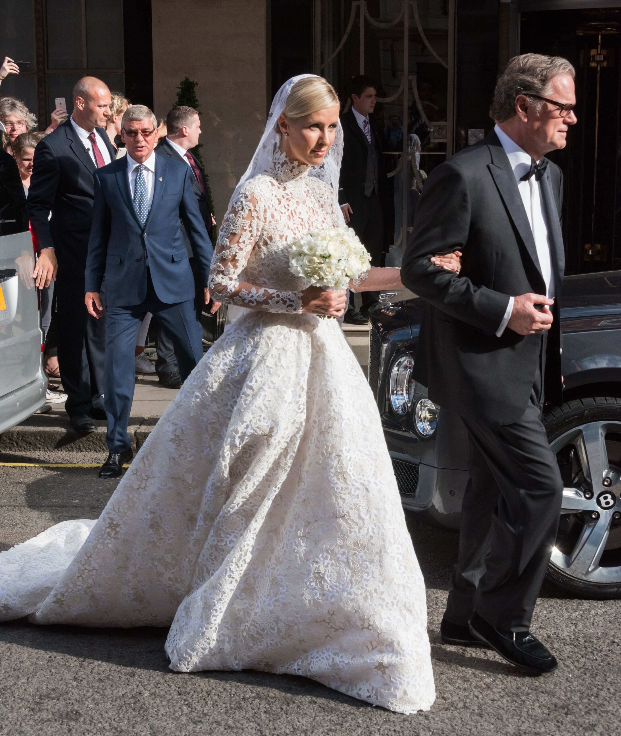 Nicky Hilton optó por un diseño de Valentino de encaje con cuello alto, manga larga y una espectacular falda bordada.