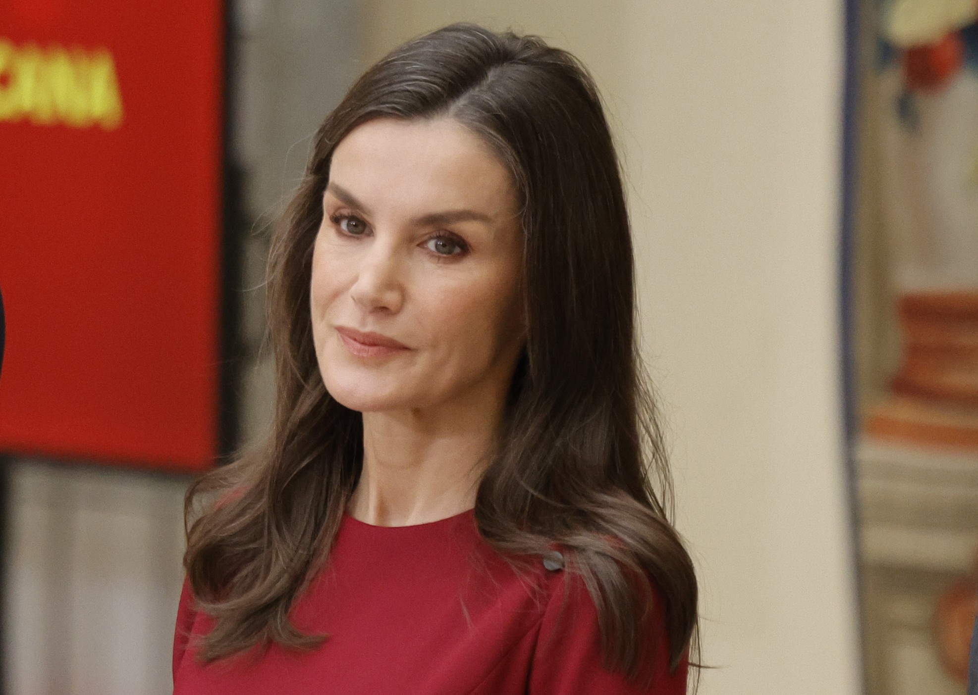 Para celebrar los méritos de los galardonados y que la atención se centrara en ellos en lugar de en su elección estilística, la Reina no ha querido llamar la atención y ha vuelto a apostar por el color rojo como estrella de su look, como suele hacer en este tipo de ocasiones. Ha elegido un vestido rojo burdeos de Carolina Herrera, de cuello redondo, largo midi y manga larga, con botones negros en la zona de los hombros, ligero vuelo y dos pliegues laterales en la zona de la falda. Se trata de un vestido que estrenó hace 4 años con motivo de un viaje a Reino Unido en 2022 para inaugurar una exposición sobre Zurbarán donde coincidió con el rey Carlos III, y donde pone de manifiesto su apuesta por reciclar prendas. Como complementos, ha elegido unos zapatos de tacón sensato con hebilla negra de Magrit, pendientes pequeños de brillantes y su anillo de Coreterno en el dedo índice.