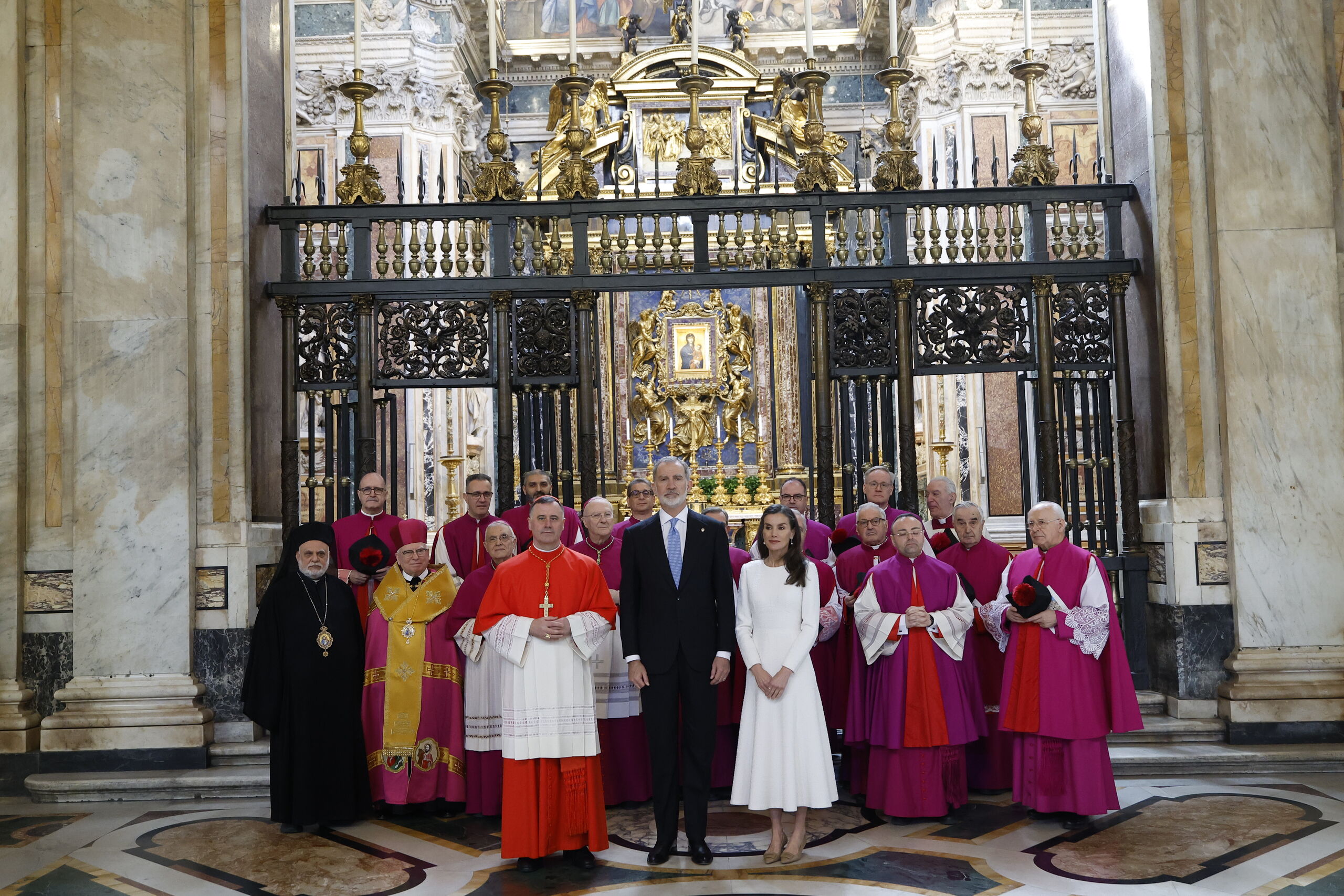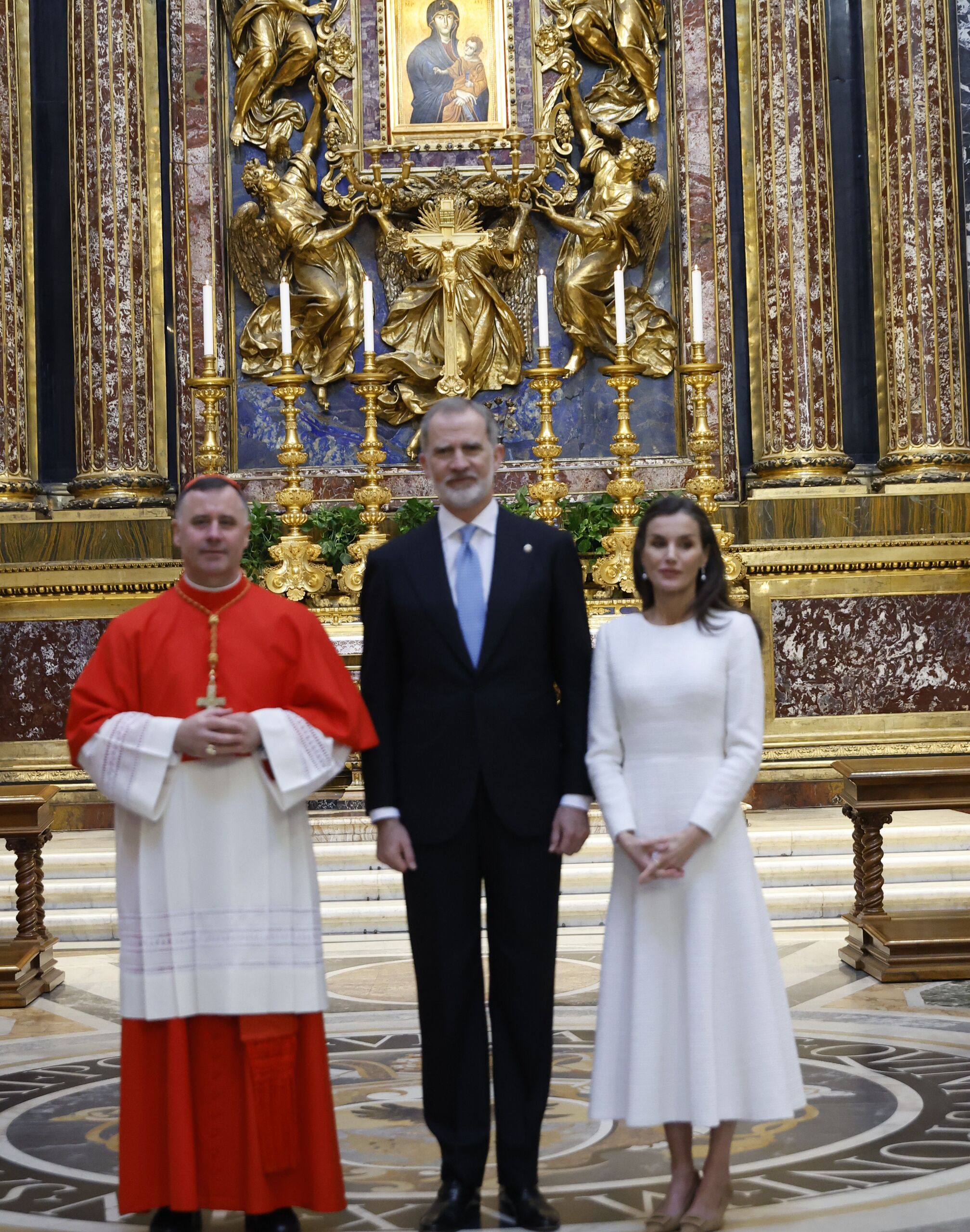 Los Reyes, acompañados por el cardenal arcipreste posando en la Capilla Paulina, donde visitaron la imagen de la Virgen de la Salud o Salus Populi Romani, patrona de Roma