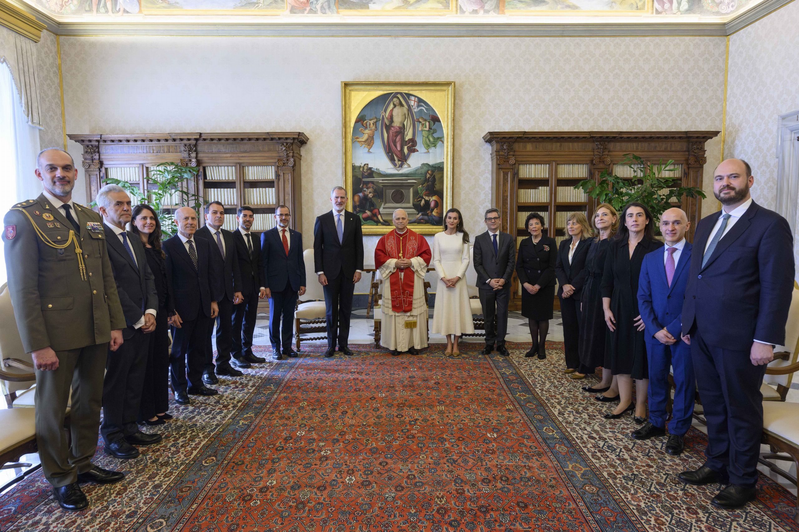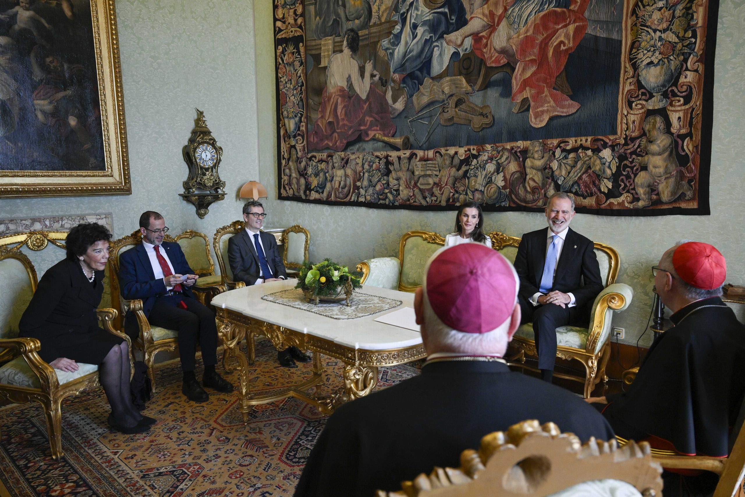 Los Reyes y el Santo Padre con la delegación española presente en la audiencia, entre ellos el ministro de la Presidencia, Justicia y Relaciones con las Cortes, Félix Bolaños, y por la embajadora de España ante la Santa Sede, Isabel Celáa.