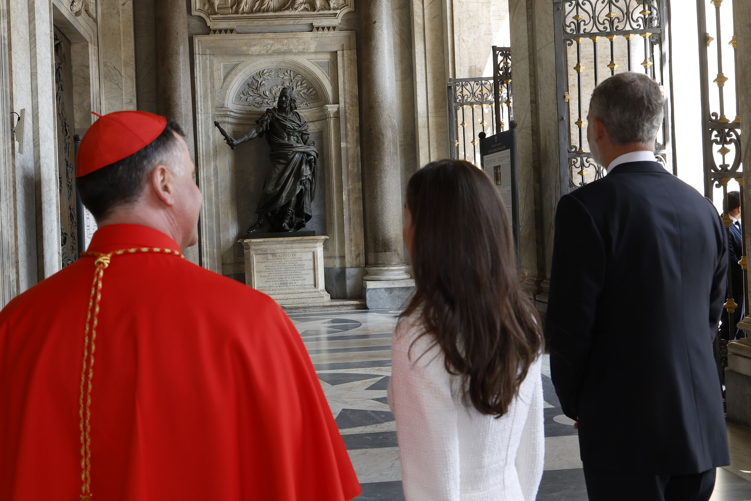 Los Reyes contemplando la estatua de Felipe IV, diseñada por Bernini situado en el pórtico del templo.