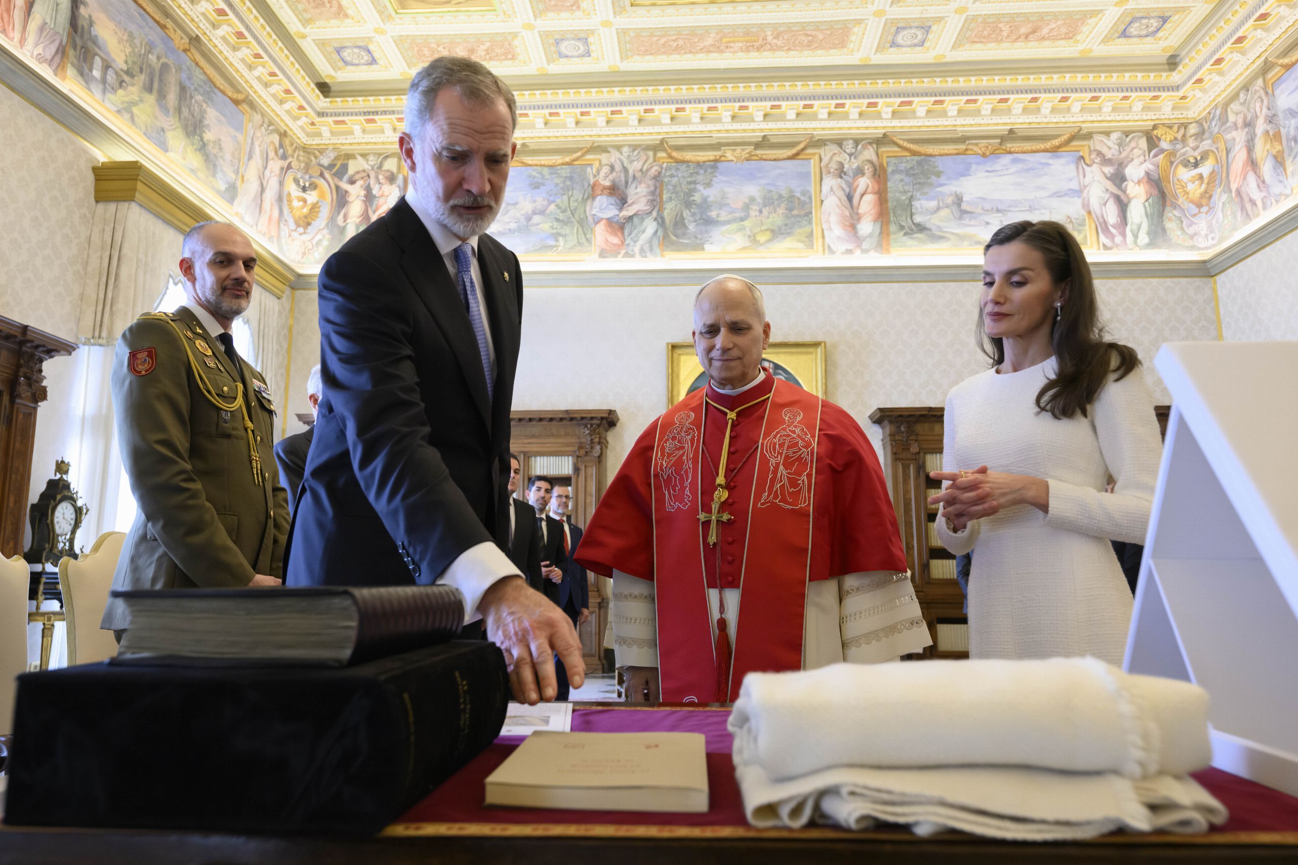 Los Reyes durante el tradicional intercambio de regalos que han obsequiado a León XIV: un facsímil del Libro de Horas de Felipe II, y una manta de butaca artesanal de lana merina y seda natural