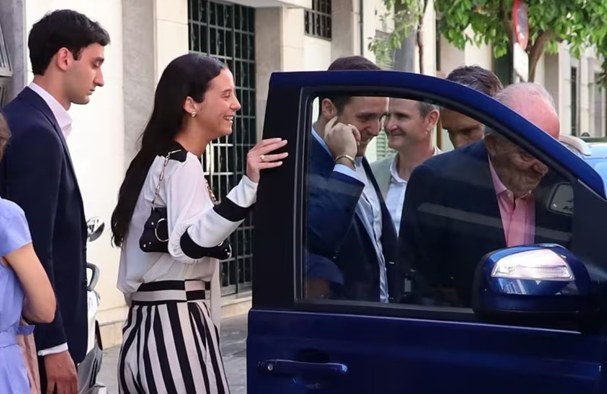 Desde el aeropuerto se ha dirigido en una furgoneta azul marino hacia el Hotel Vincci La Rábida, en la sevillana calle Castelar, donde le estaban esperando sus nietos, Victoria Federica de Marichalar, con quien se ha abrazado efusivamente y Felipe Juan Froilán, a quien ha saludado a continuación. En último lugar ha saludado al novio de Victoria Federica, Jorge Navalpotro. La infanta Elena no estaba presente ya que, a la misma hora, acudía al pregón taurino que ha realizado el periodista Rubén Amón en el Teatro de la Maestranza.