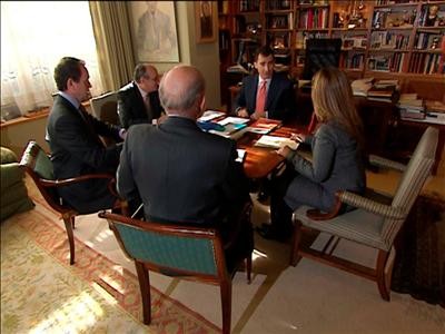 El Príncipe de Asturias durante una reunión preparatoria de su viaje a Argentina, el pasado día 4 de diciembre, junto a la secretaria de Estado para Iberoamérica, Trinidad Jiménez; el jefe de la Casa de S. M. el Rey, Alberto Aza; el jefe de la Secretaría del Príncipe, Jaime Alfonsín, y el secretario de Estado de Turismo y Comercio, Pedro Mejía (d-i). (EFE)