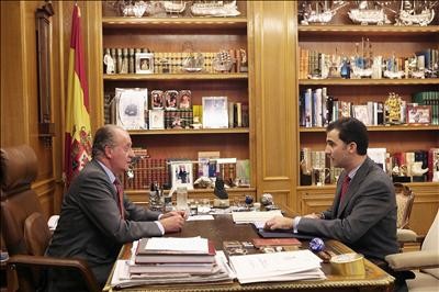 El rey Don Juan Carlos se reúne en su despacho con su hijo, el príncipe Felipe, para tratar diferentes asuntos de sus respectivas agendas de trabajo, el pasado 19 de diciembre. (EFE)