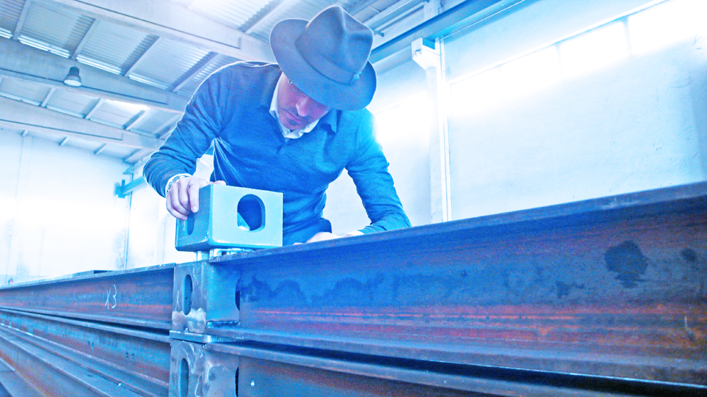 Armado con un sombrero Fedora a lo Indiana Jones, Del Burgo muestra una anciana comprensión hacia otra de sus creaciones: una viga.