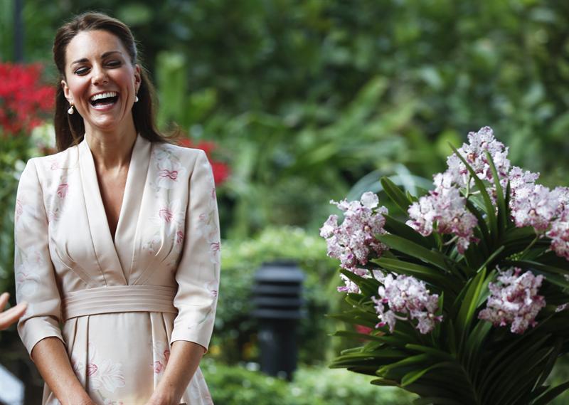 La duquesa de Cambridge ríe junto a una orquídea híbrida plantada en su honor durante una visita al Jardín de Orquídeas