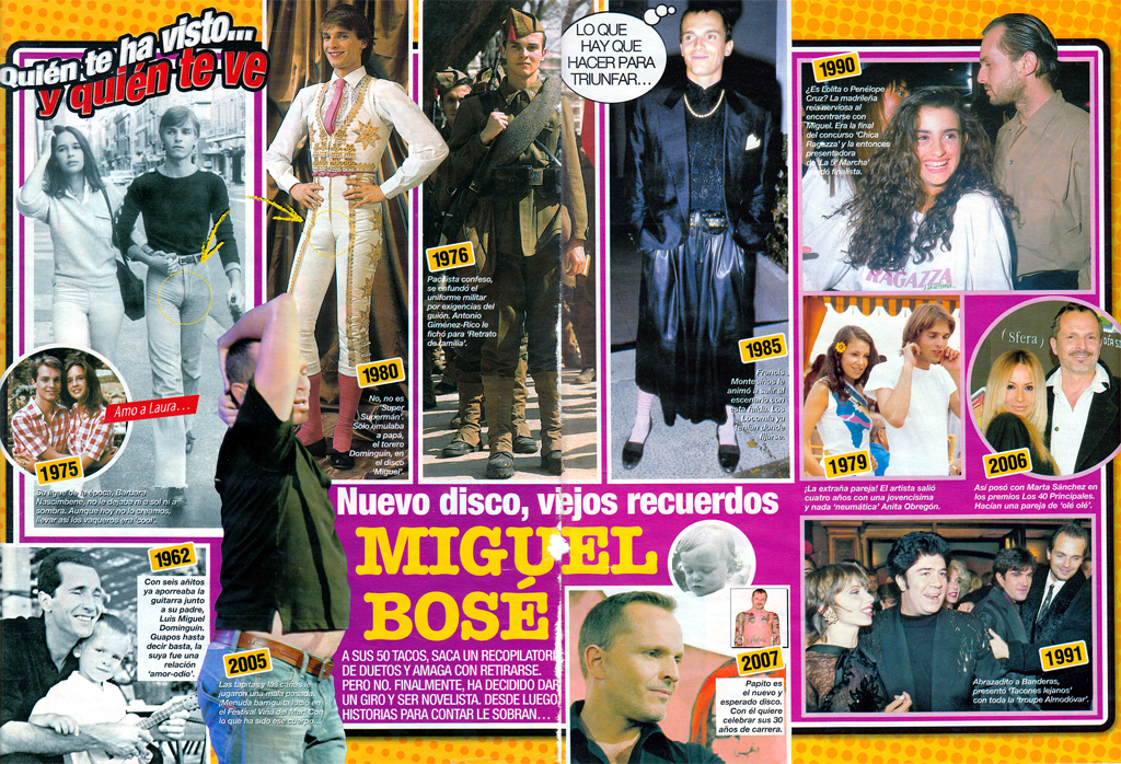 Cada vez que Bosé saca disco nuevo, las revistas hacen labor de arqueología buscando imágenes. Y es que Miguel es de esos artistas que han llenado páginas con sus cambios de look. Este reportaje a doble plana se publicó a la vez que Papito, su anterior trabajo.