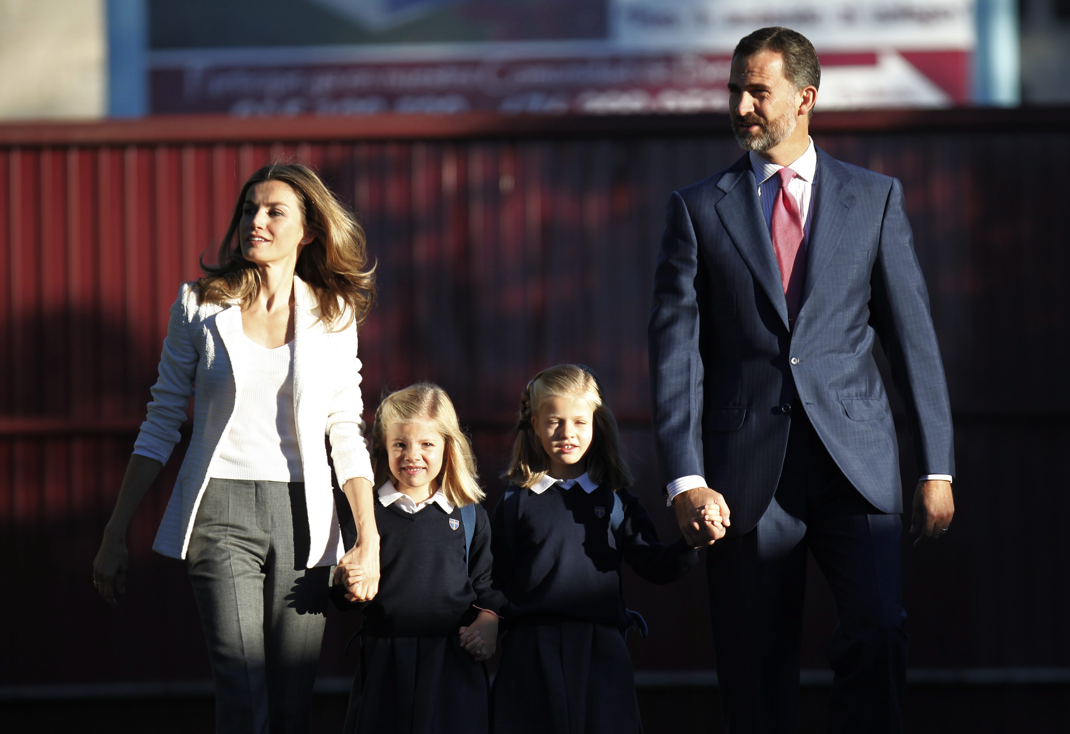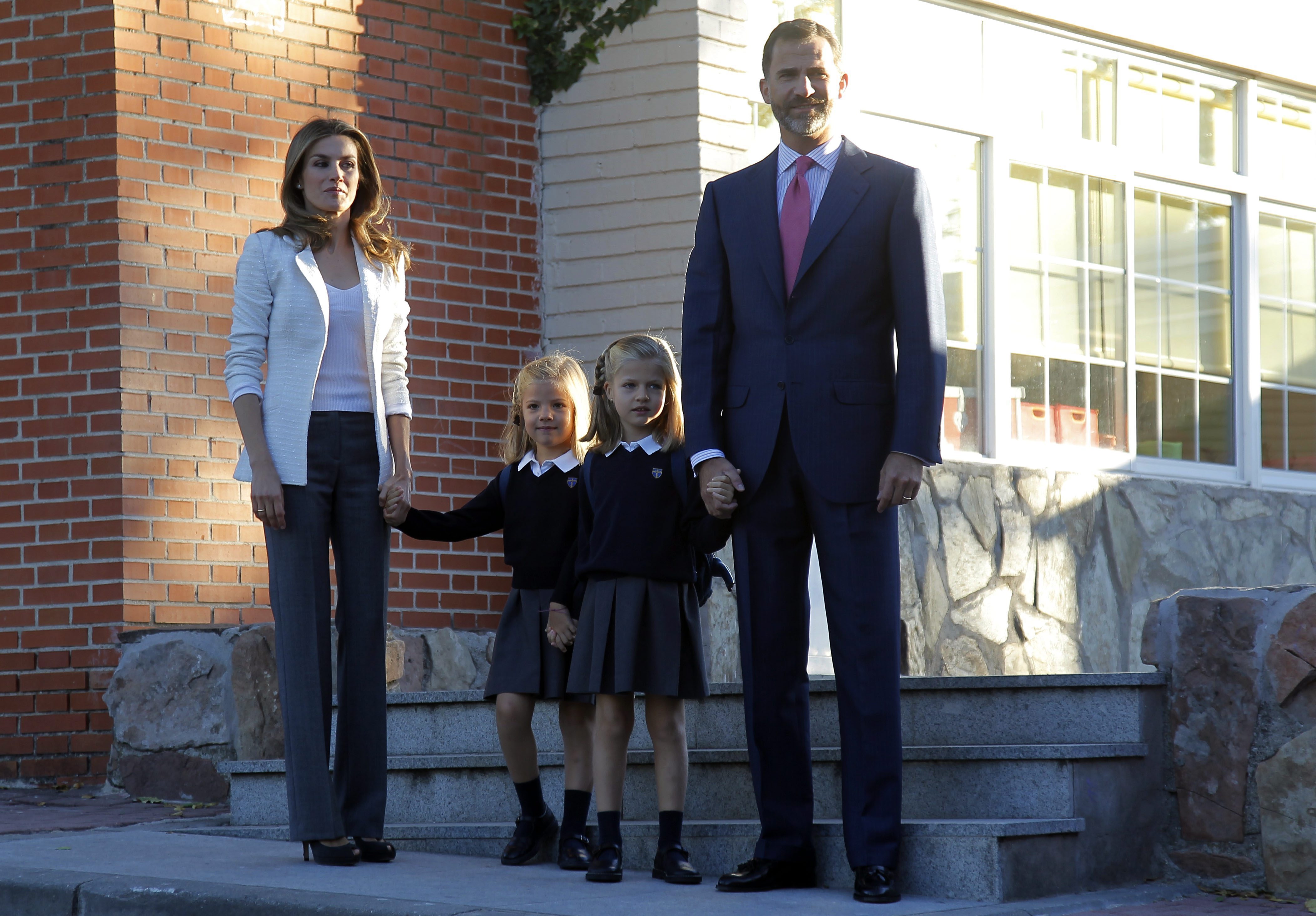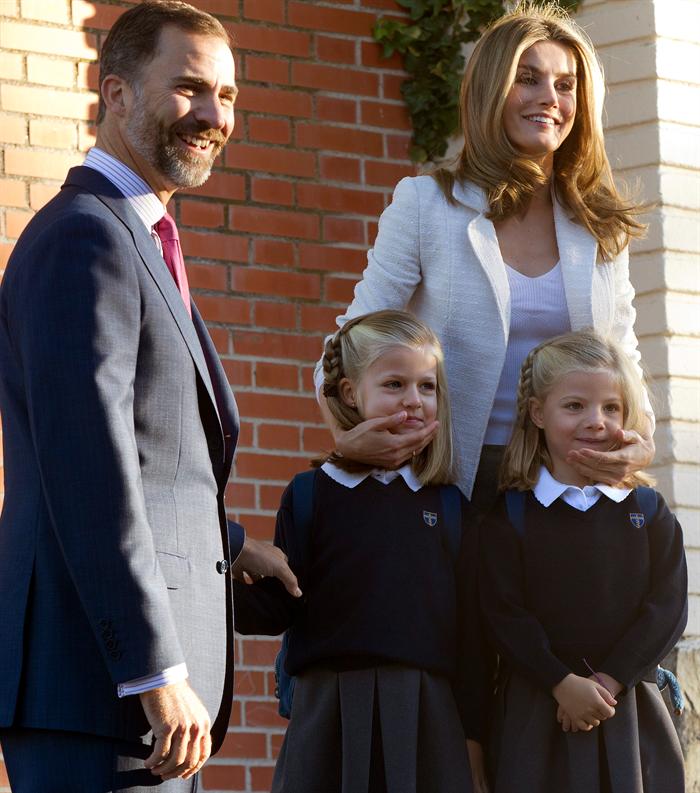 Los príncipes de Asturias han posado junto a sus hijas, Leonor y Sofía, a su llegada al colegio Santa María de los Rosales el primer día de clase y la víspera del 40 cumpleaños de doña Letizia, que celebrarán "tranquilos" y "en casa", según ha explicado ella a los periodistas. Las dos hermanas posan sonrientes de la mano de sus padres.