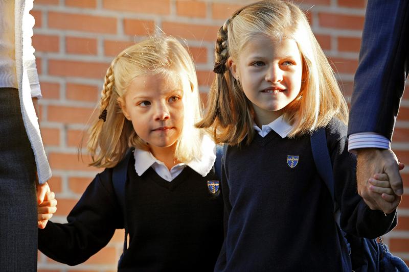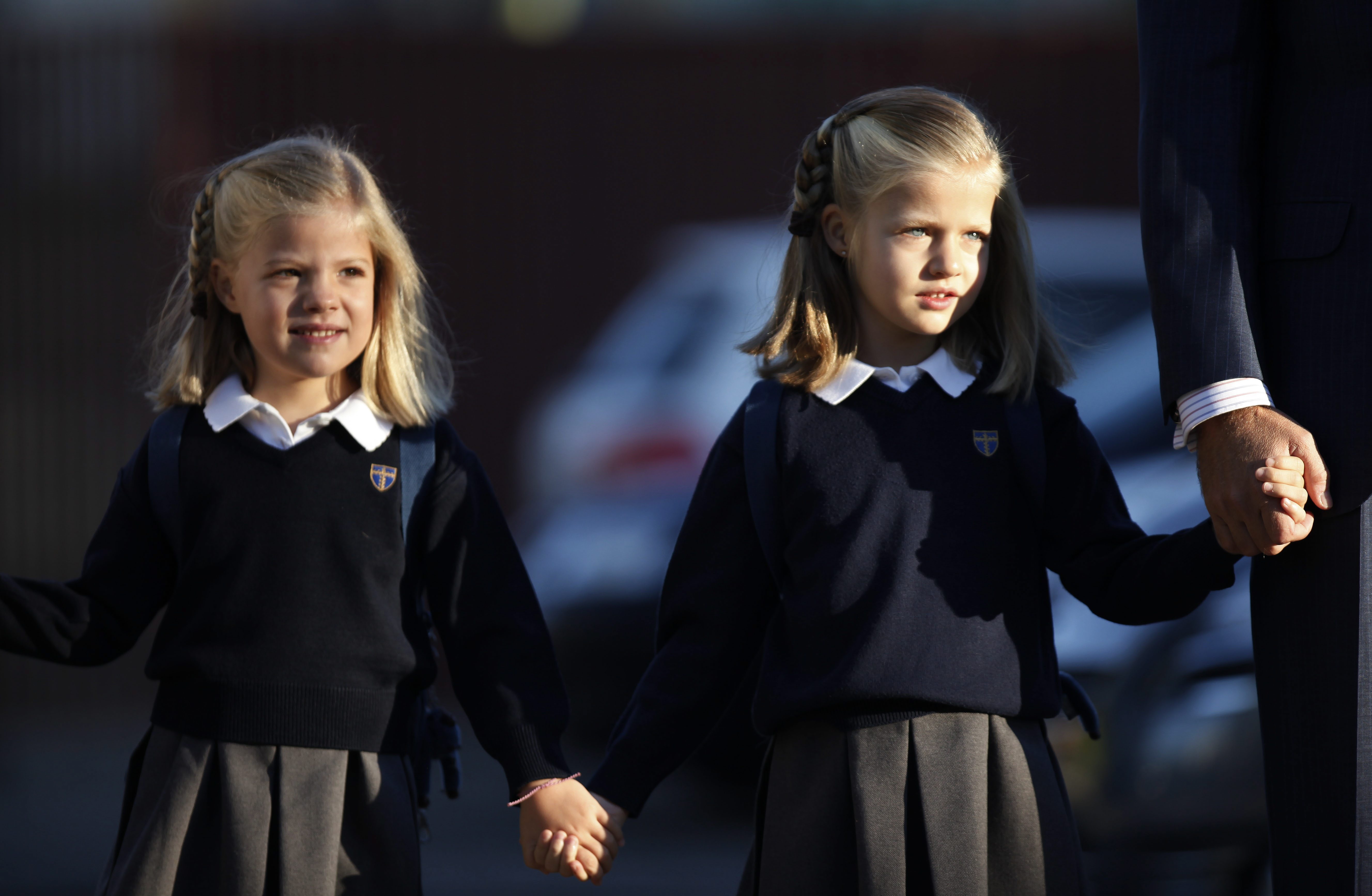 Las pequeñas Leonor y Sofía, hijas de los príncipes de Asturias, reanudan sus clases de este año en el colegio Santa María de los Rosales.