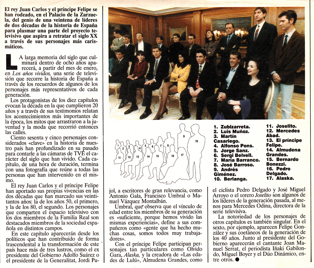 Esta semana todos hablamos de la foto generacional de la princesa Letizia. Rebuscando en mi desván he encontrado el testimonio de que el príncipe Felipe ya cumplió con ese rito de paso en su momento. El programa documental de Televisión Española Los Años Vividos reunió para la foto a los que, como el príncipe, habían cumplido veinte años en la década de los ochenta.