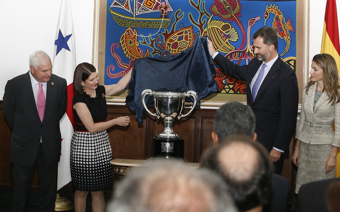 El príncipe Felipe y la primera dama panameña, Marta Linares, muestran la Copa del Centenario, un trofeo que se disputarán las selecciones de Panamá y España en un partido amistoso