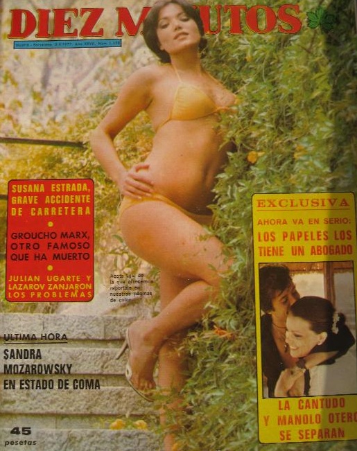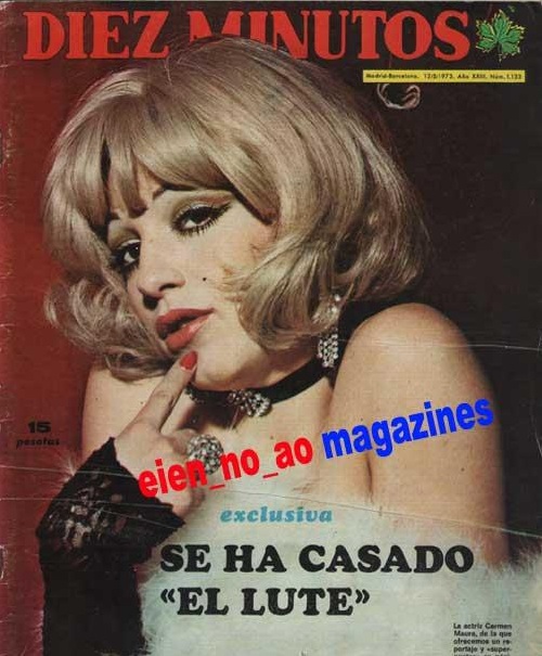 Difícil reconocer a la Carmen Maura de 1973. Diez Minutos dedicaba sus portadas y pósters a las actrices jóvenes en posados picantones. El Lute se asoma en el texto de portada, la actualidad rosa y la crónica negra siempre se han dado la mano.