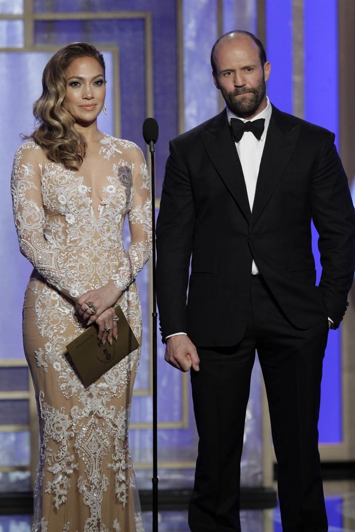 La cantante y actriz estadounidense Jennifer Lopez (izq) y el actor británico Jason Statham (der) durante gala de la 70 edición de los Globos de Oro.
