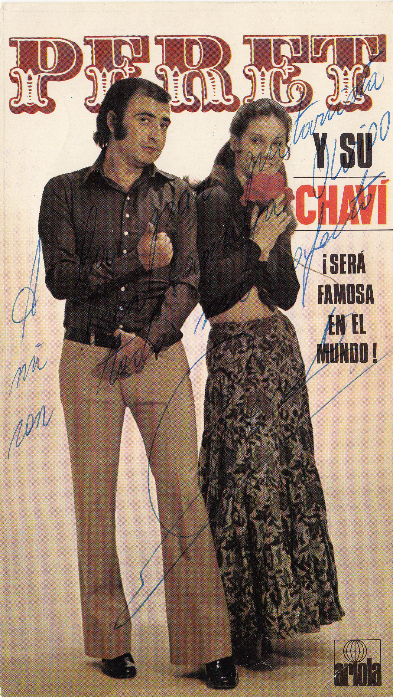 Eso les firmó Peret a mis padres en esta tarjeta cuando le contaron que su hijita tocaba la guitarra. Yo tenía nueve o diez años y es el primer autógrafo que conservo.