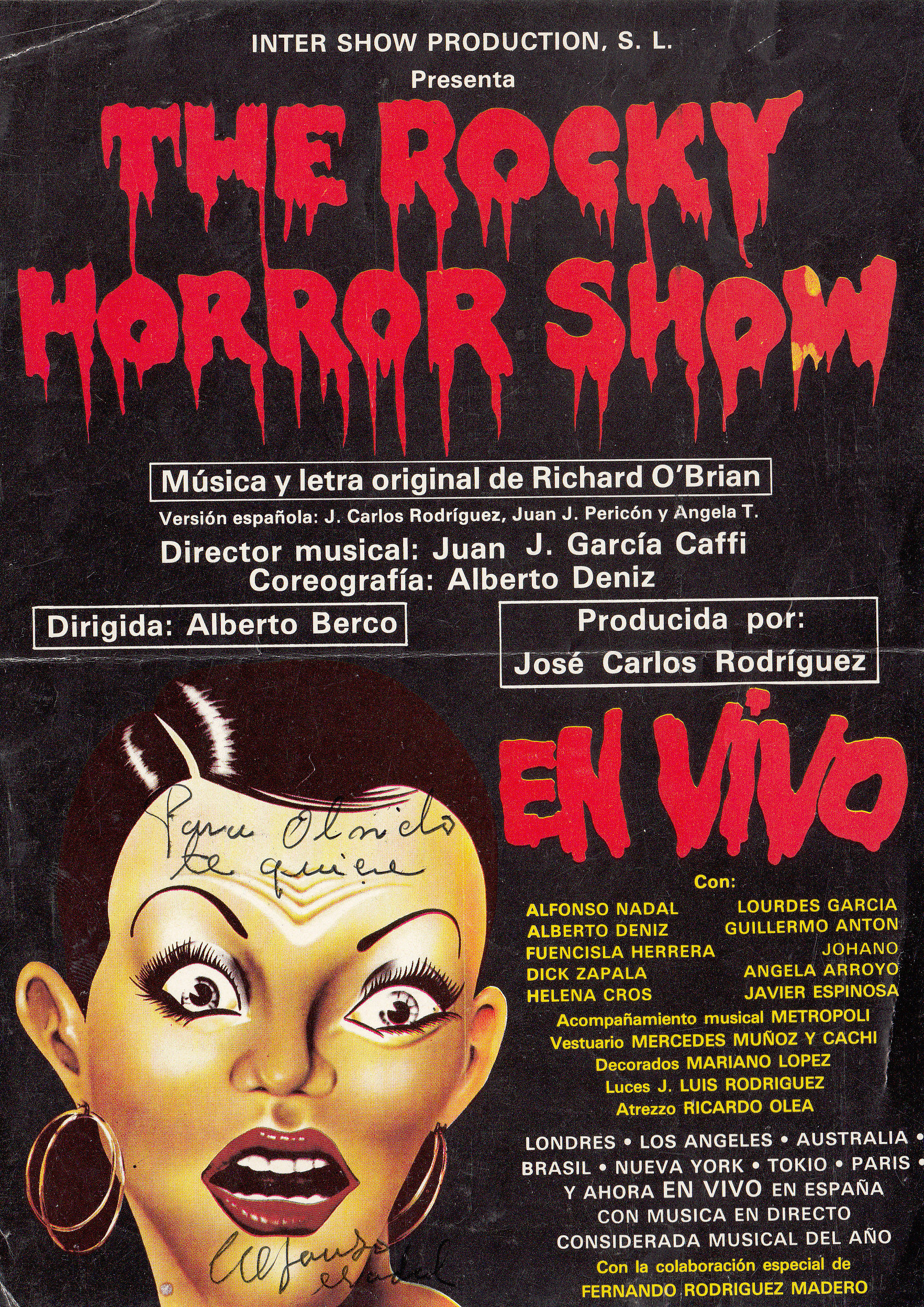 Alfonso Nadal interpretaba a Frank-N-Furter en la adaptación teatral española del musical. La ponían en la sala Cerebro, debajo de mi casa, pero nunca pude verla por ser menor de edad. Años después alguien me consiguió este cartel firmado por el protagonista.