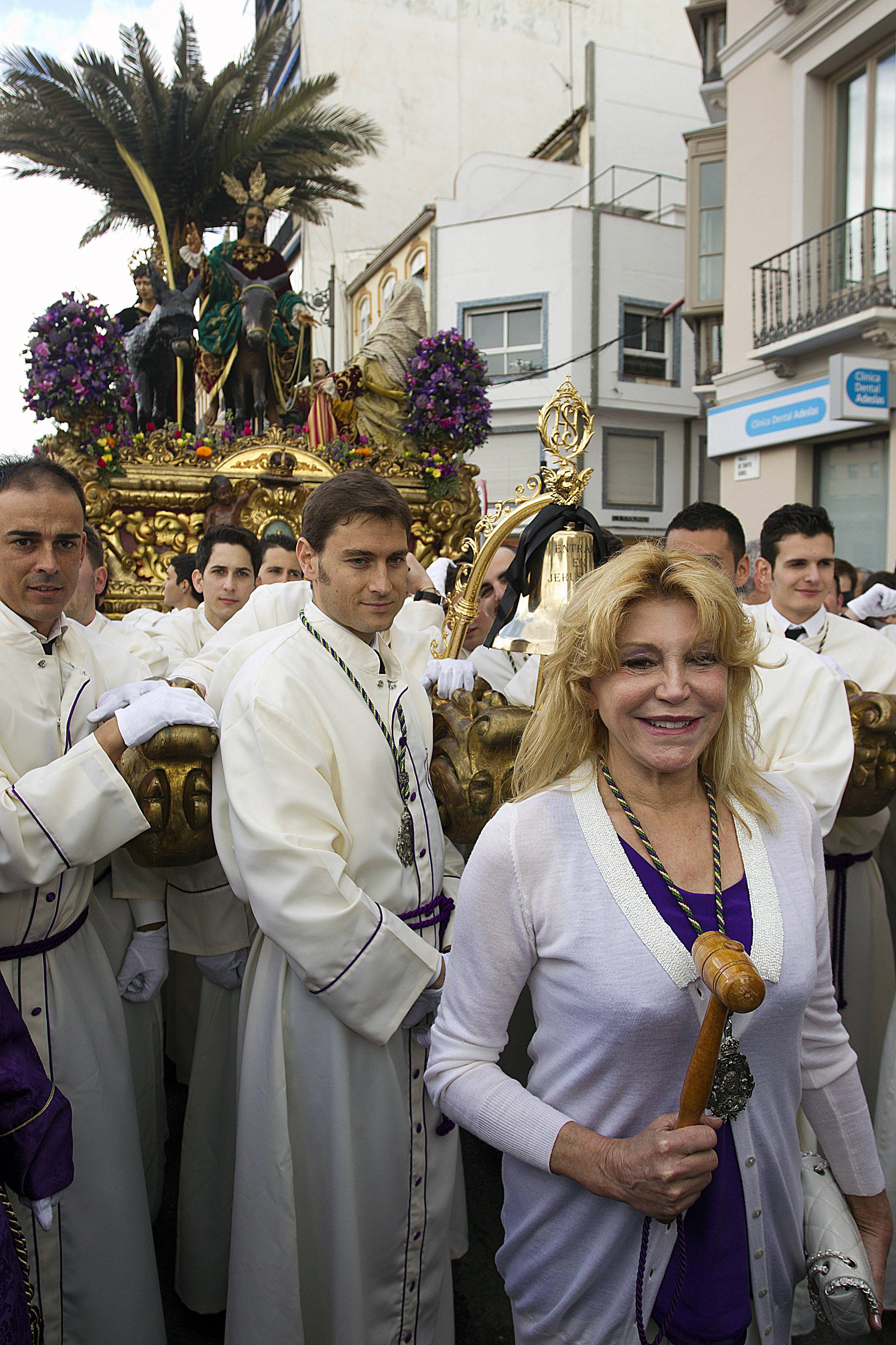 Para Banderas, "la época de sacar el trono se acaba este año con la Virgen de la Esperanza, que acaba este año después de diez años. Mi hermano lleva 25 y se retira ya, hay que dejar paso a las generaciones nuevas, yo ya soy un cincuentón, asumo otras responsabilidades como la mayordomía". ENn la imagen, la baronesa Thyssen.