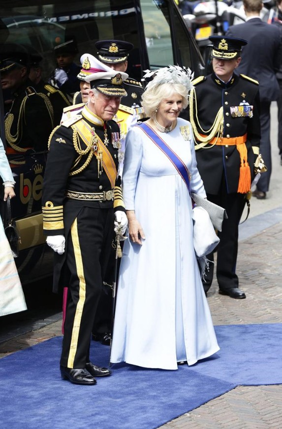 El príncipe Carlos de Inglaterra (izda) y su mujer, Camila duquesa de Cornualles (dcha), a su llegada a la ceremonia de investidura del rey Guillermo-Alejandro.
